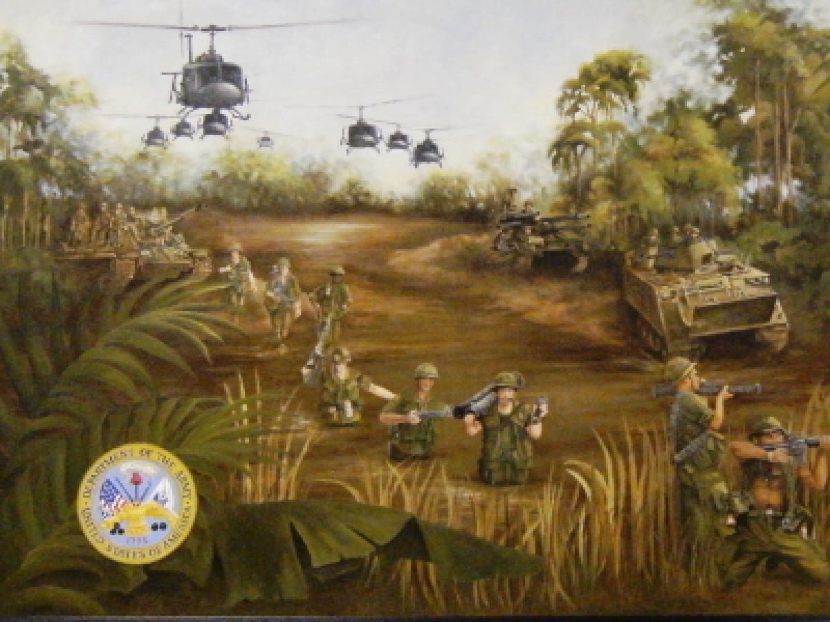 You Are Not Forgotten (U.S. Army) is a 30 x 48 inch oil painting located at the Eastern Nebraska Veterans' Home to the left of room C1144B. This oil painting depicts army soldiers wading through waist deep mud in the middle of a jungle area with helicopters approaching them.