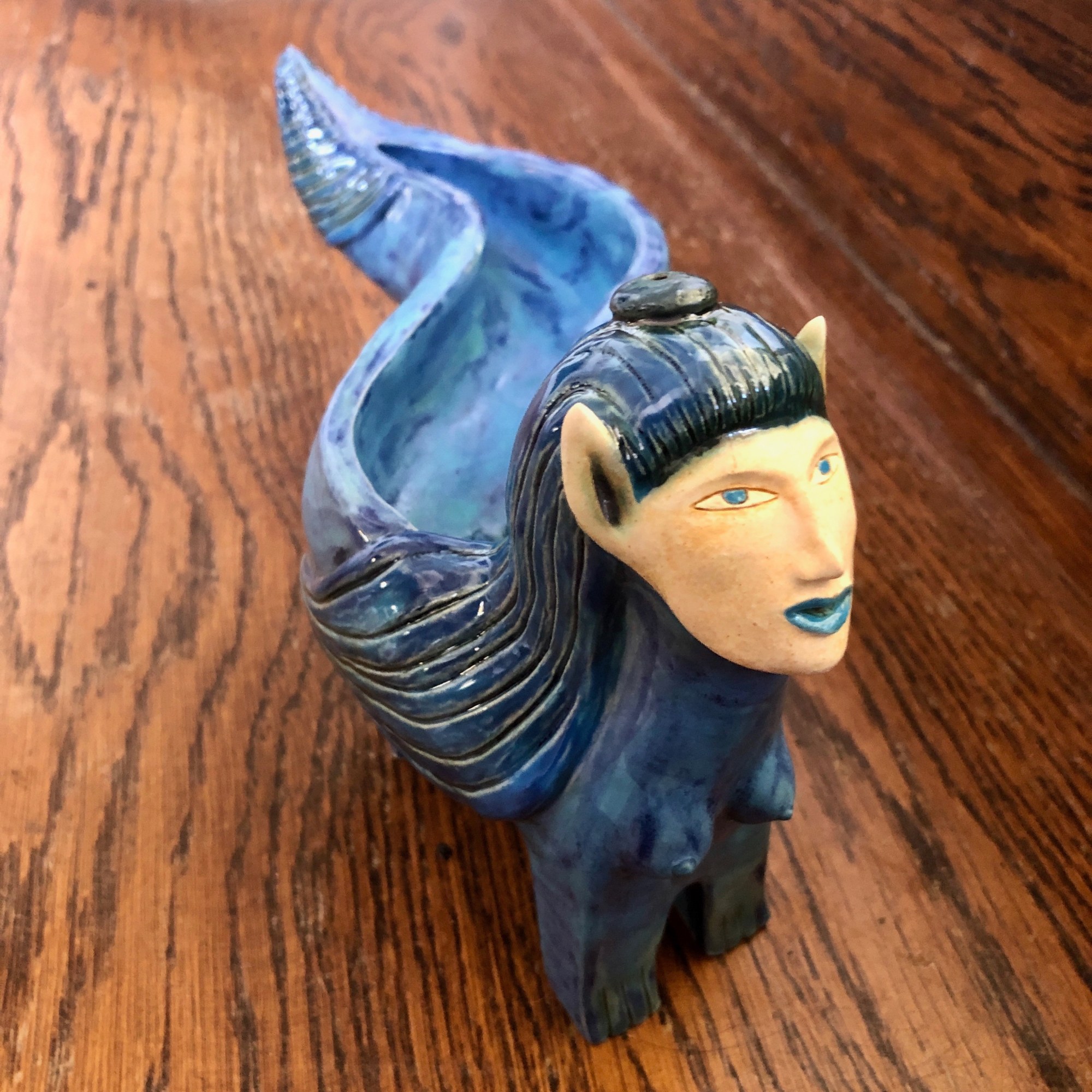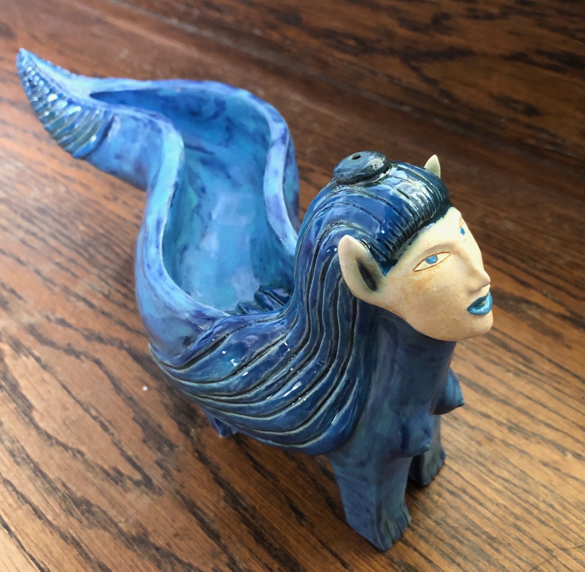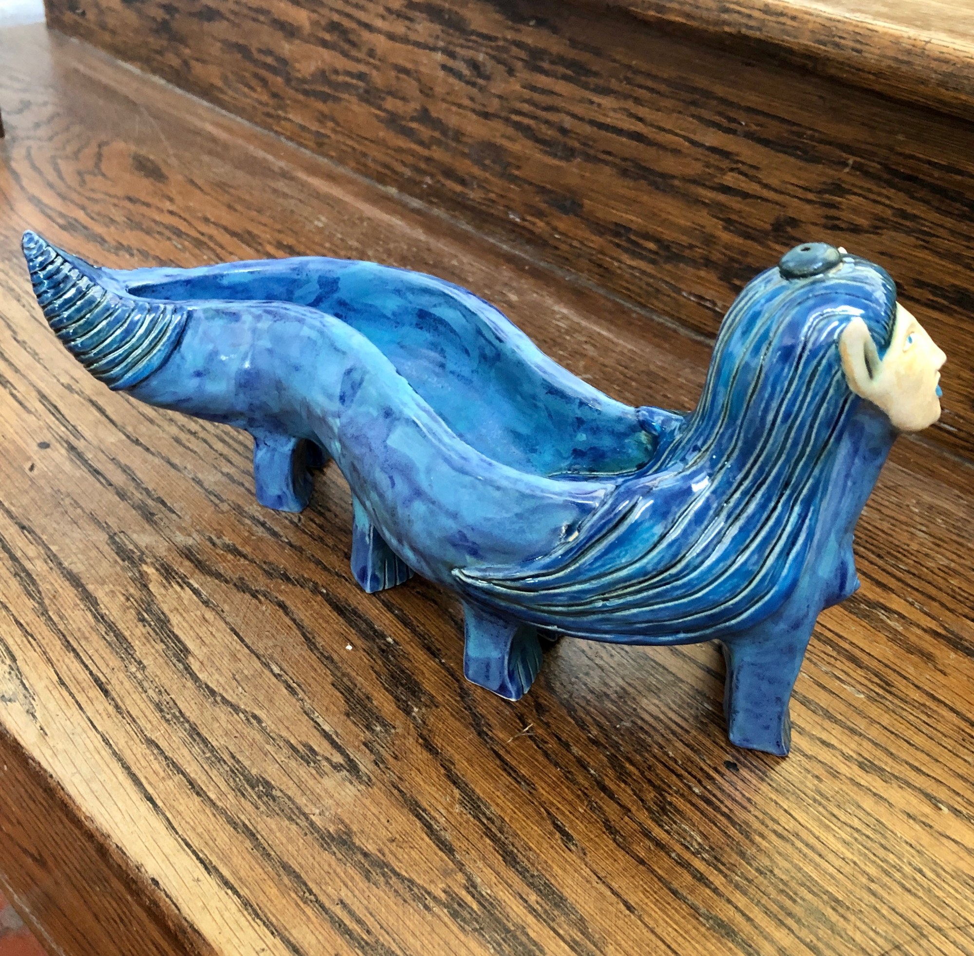 The Azure Dream curvy olive dish (with incense holder in bun) features layers of blues upon blues, with a nice slither and bun.