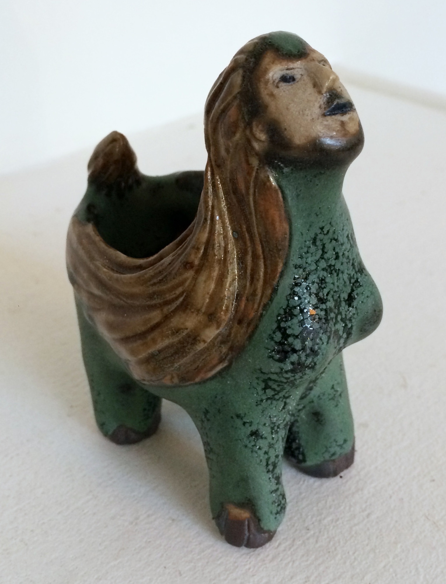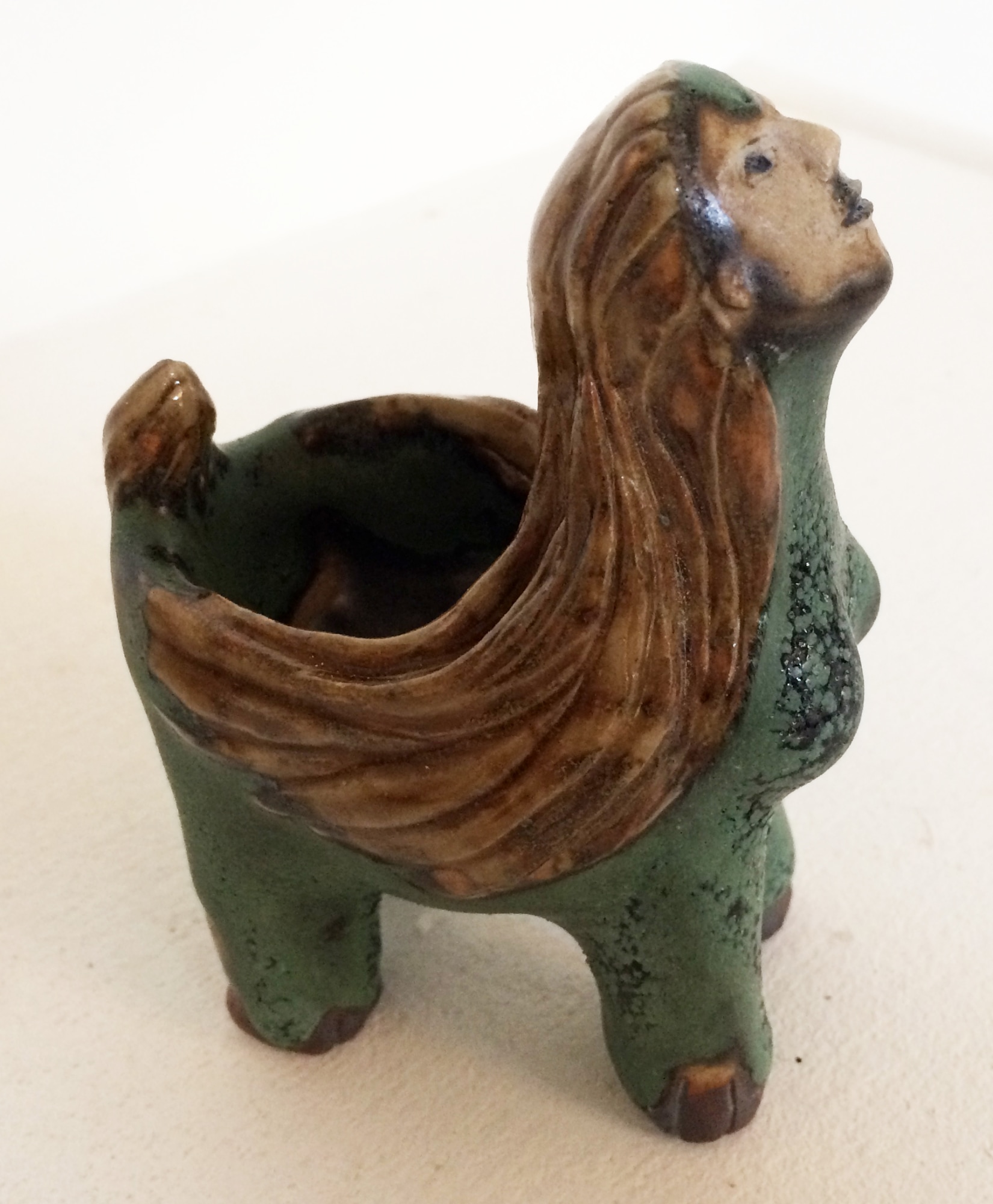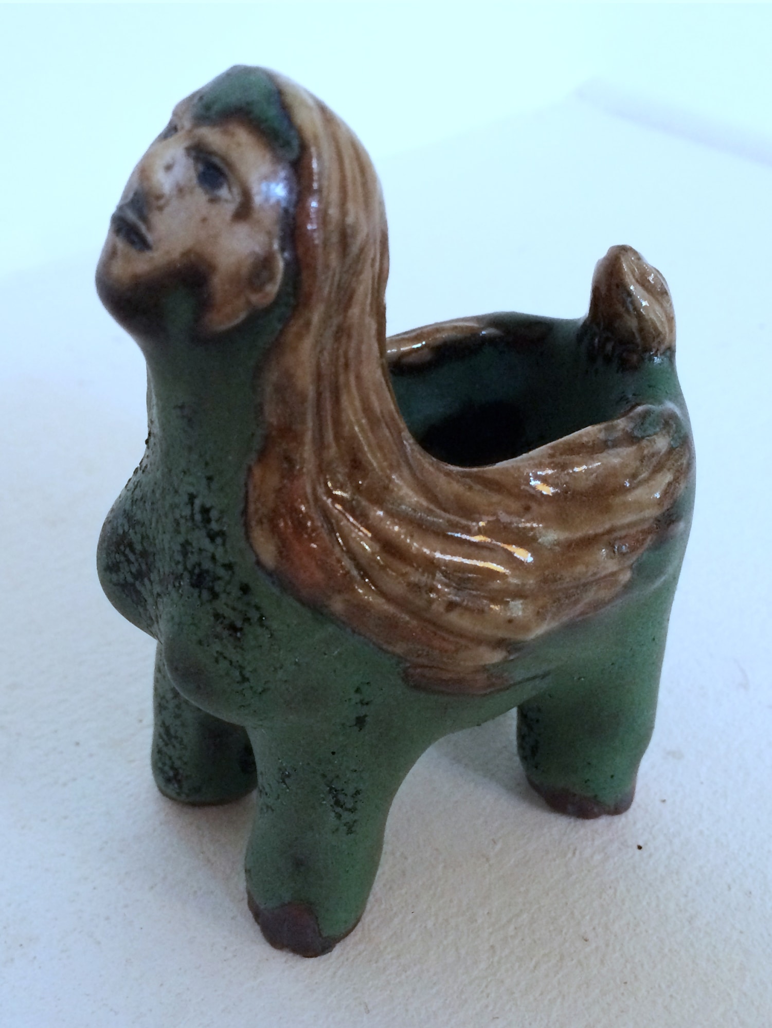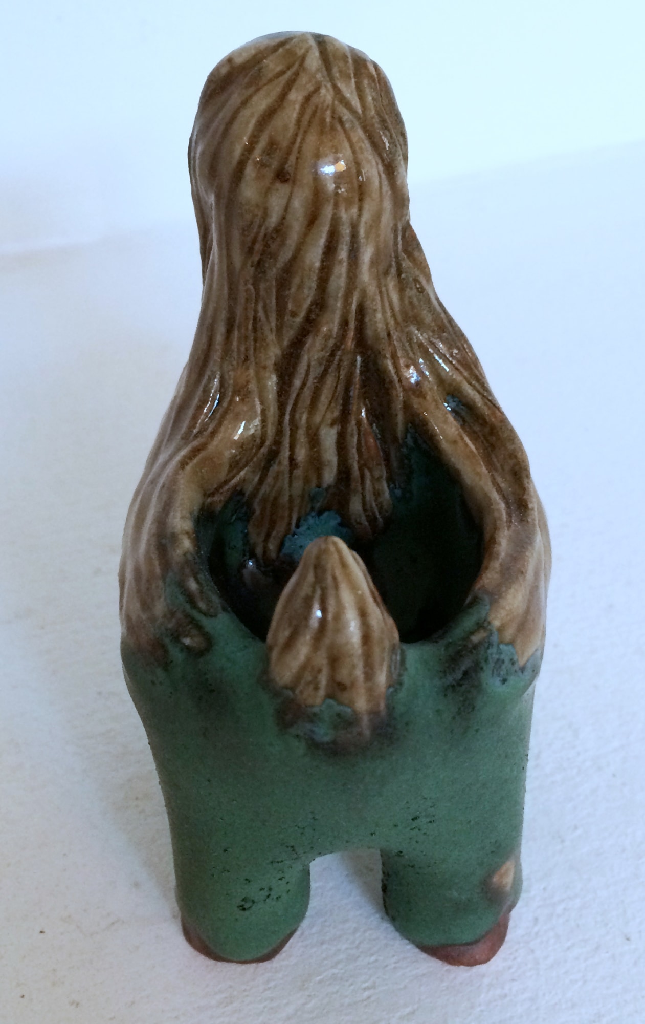 Burnadette was fired to to level crispy, and it shows on her moody dark edges and texture. She is an example of my much enjoyed forays in to sculpting hair, as inspired by a recent trip to Italy, where I was able to see and gain influence from some fantastic old and ancient sculpture.