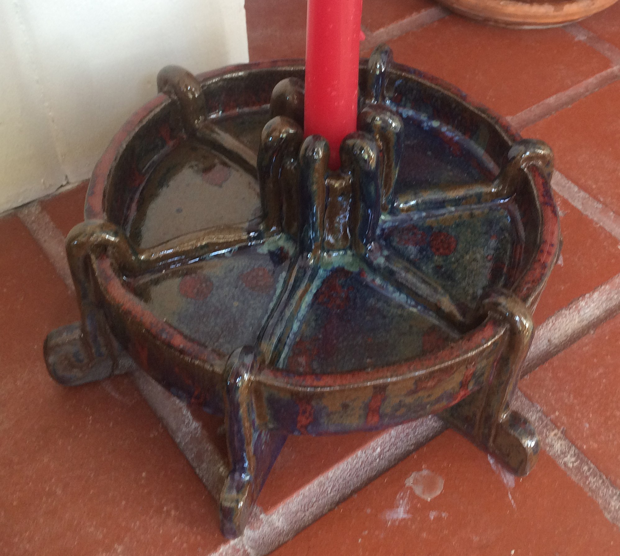 This red waterfall candle holder was glazed with Blue Monday and Chun White, and fired with reduction, giving a colorful and varied effect.