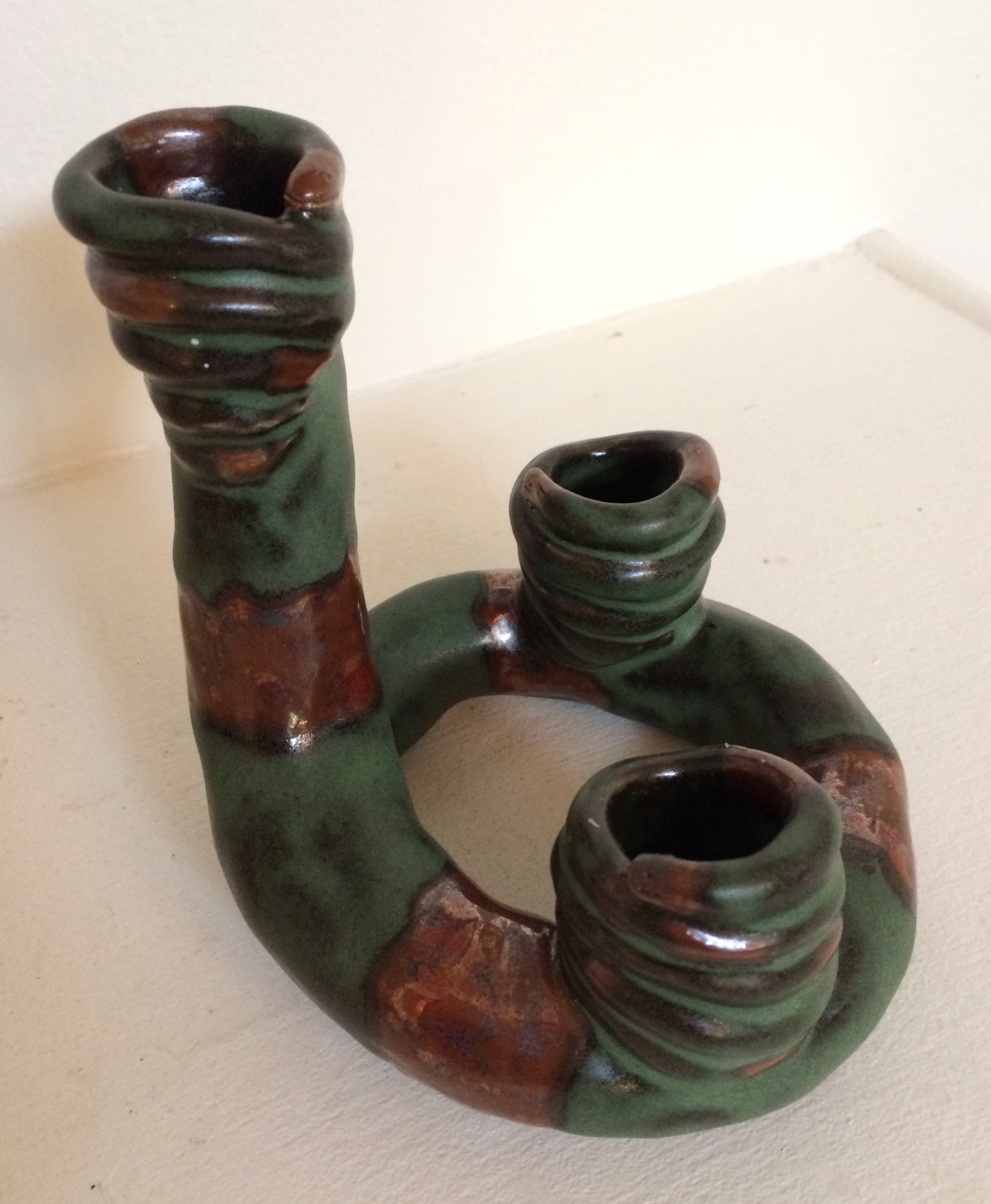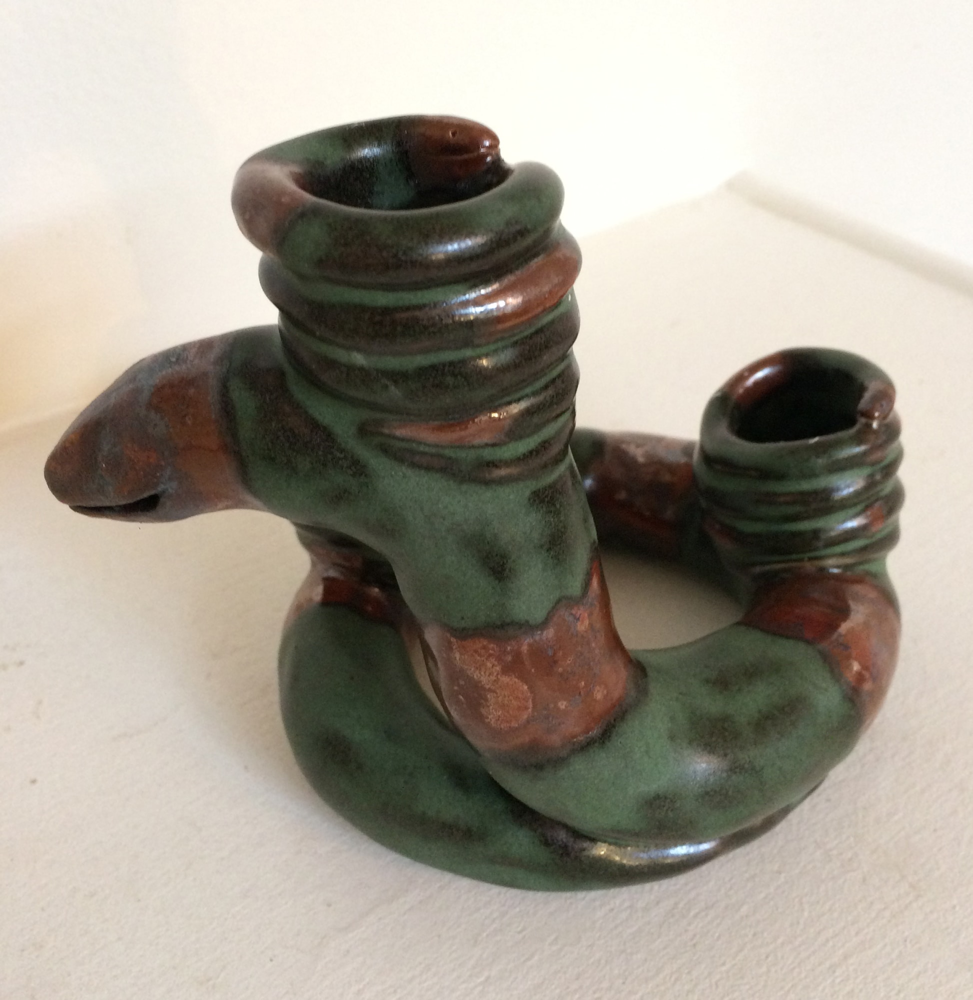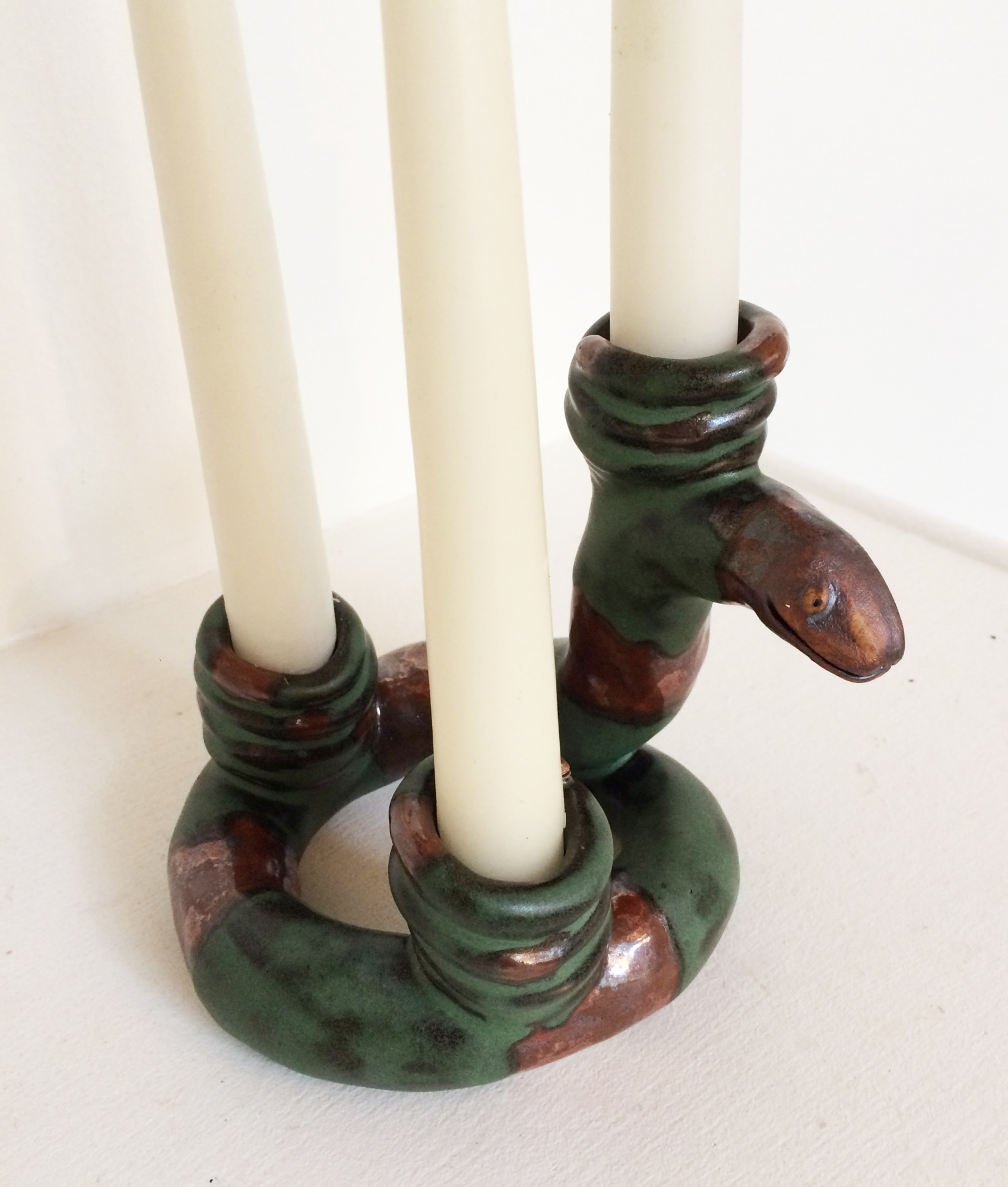 Flora the mama snake has 3 baby snakes coiled atop her that function as candle holders. She is glazed in iron oxide with Reitz green and fired with reduction.
