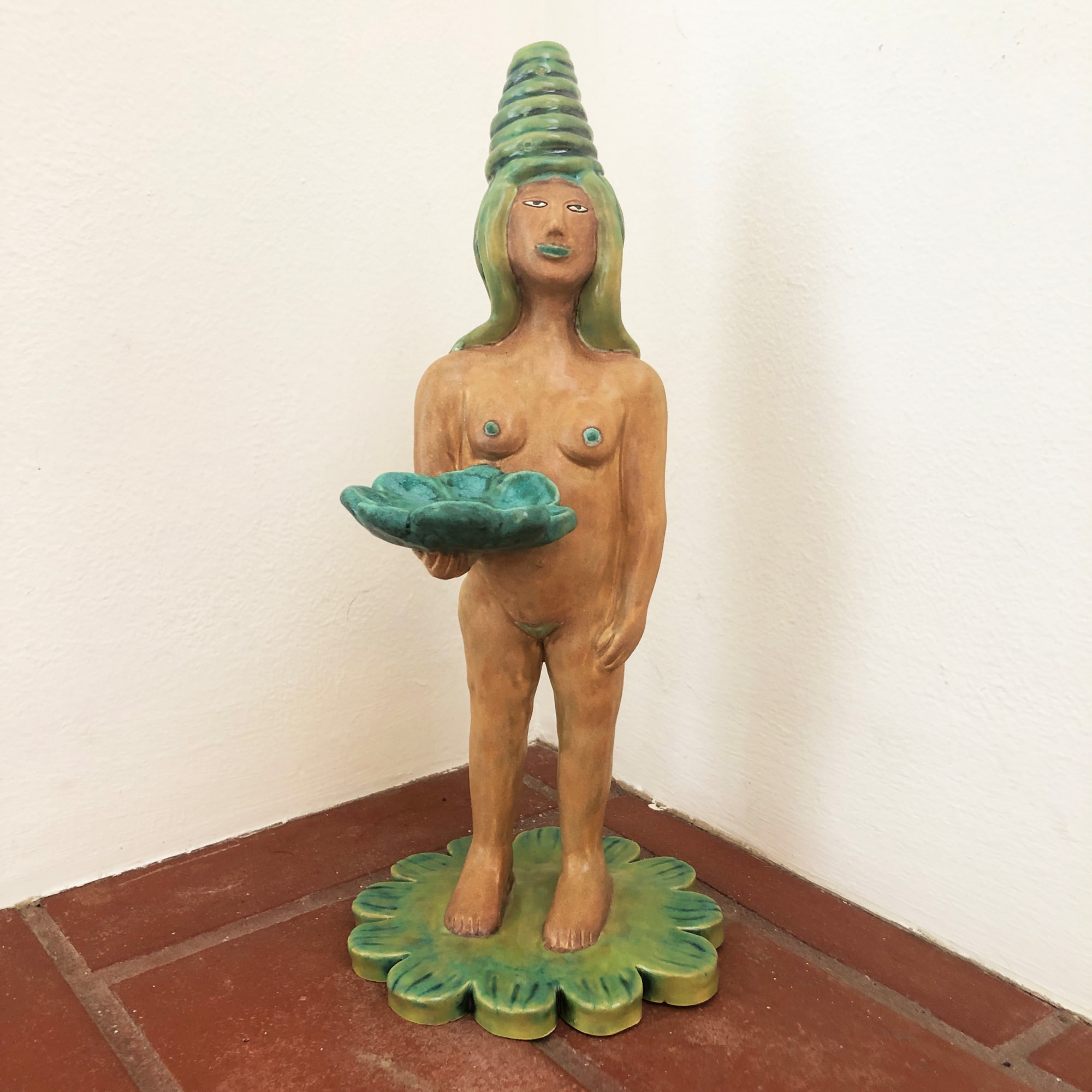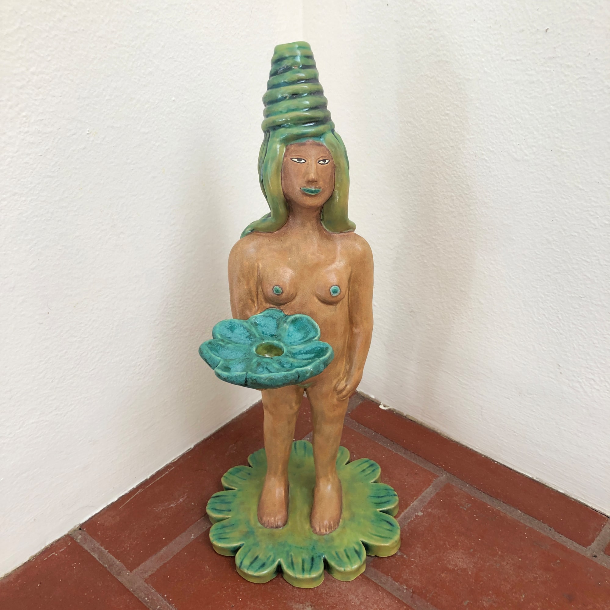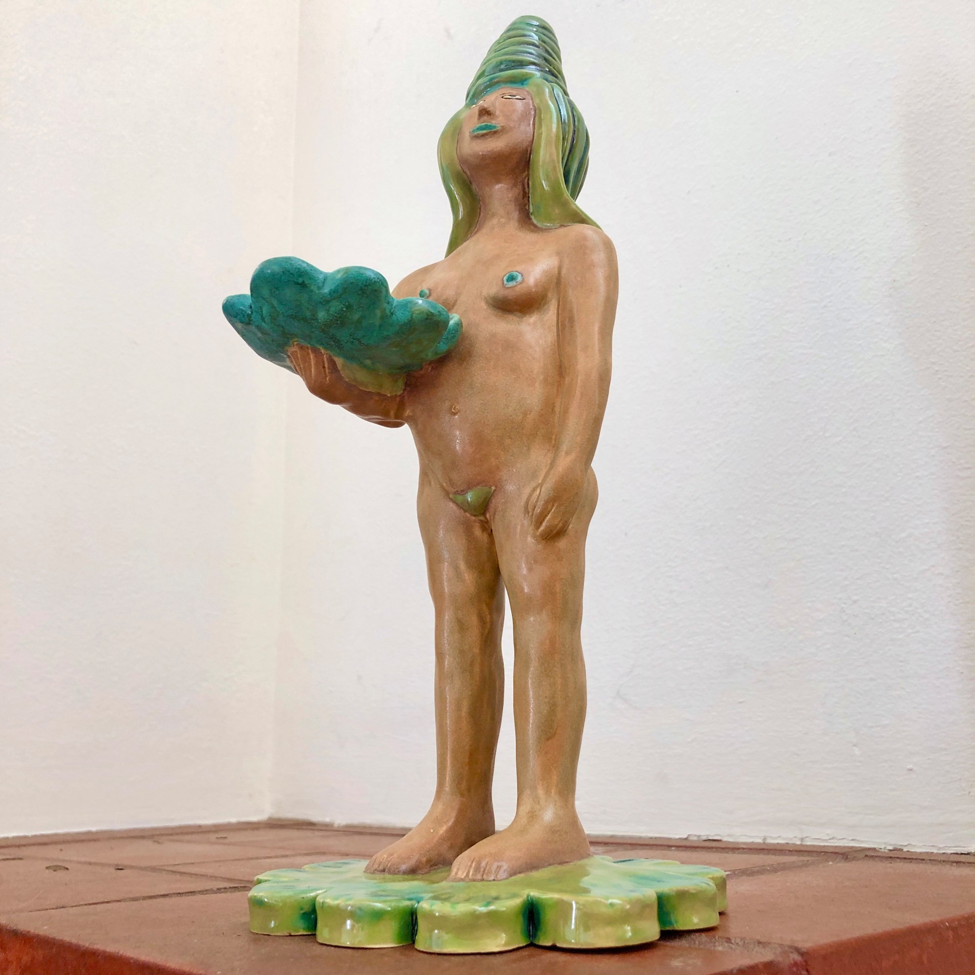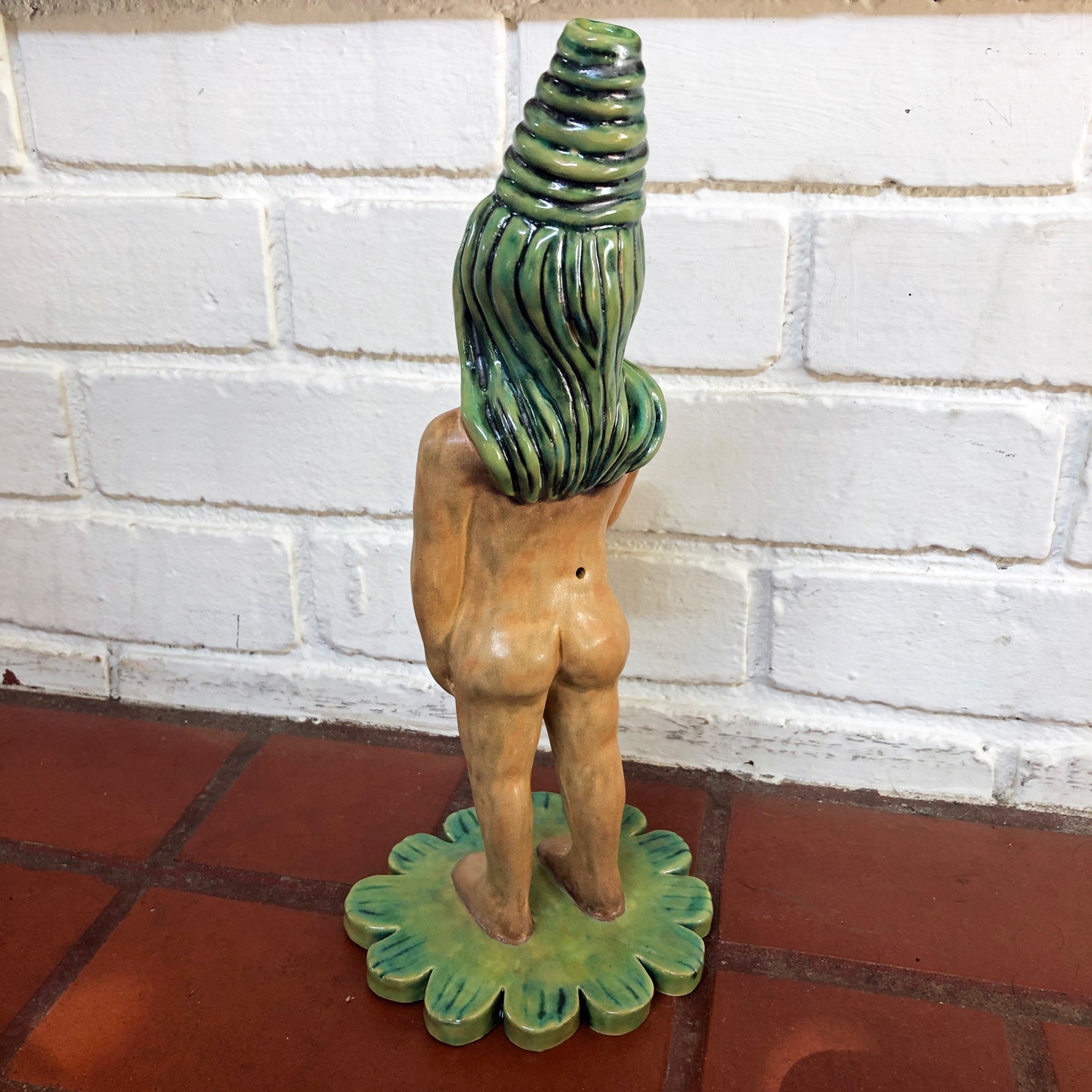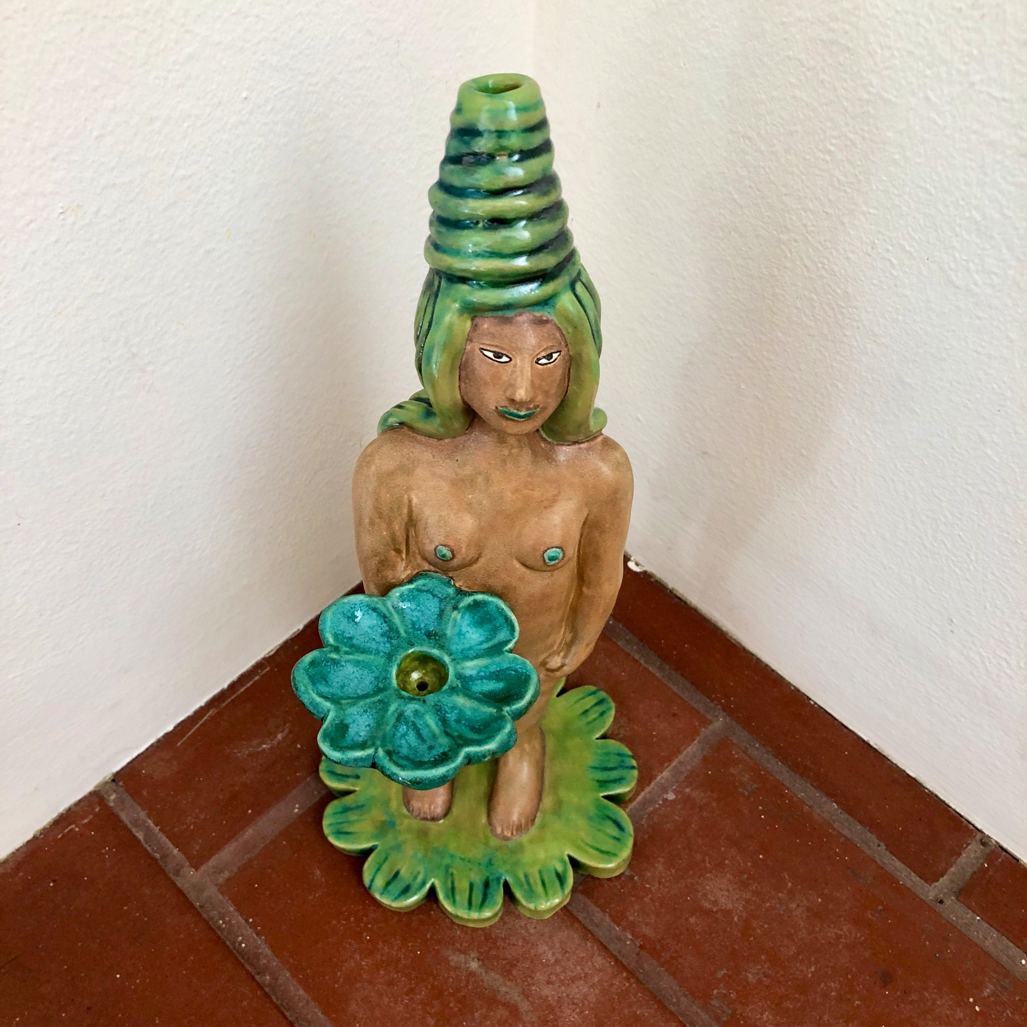 Willow, with a flower of power, has presence. She's glazed in a soft almond luster, with flowing emerald hair, and is offering a bold, intensely turquoise flower, that is also the bowl of this pipe.