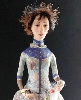 - Mixed media; Air-drying paper clay on a metal armature. Costumed in fabric and paper with a mohair wig.