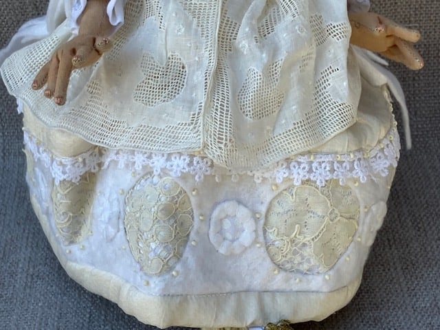 This is a lovely cloth doll that can either be displayed on a wall or sit. Cotton fabric body, wool stuffing. Features created with acrylic paint, pigma pen, Prisma color pencils. Lips, eyebrows, lids, flair of nostrils hand stitched with Gutterman’s and Sulky thread. Highlight and shadow create depth. Blouse is made of a vintage cotton hanky with added lace. Bottom of the skirt is a cutwork design in circles with vintage lace underneath. Vintage hanky is wrapped around the waist. Hair is two colors of white and pale gray fine mohair yarn with silver metallic thread highlights sewn into a sculptural styling on the side of her face. Shoes are made with cotton fabric and vintage ribbon, pleated with gold detail edges. Wool blended white layered wings. Headband is wool blended felt flowers and white floral wire.