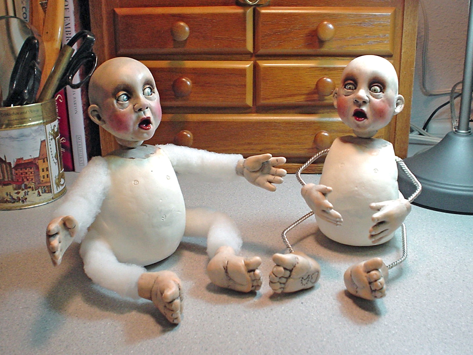 Mixed media. Original design, sculpted and molded by Chomick+Meder. Hand cast solid resin, hand painted with acrylics, and coated with matte varnish. The poseable arms/leg are braided wire armature with polyester batting. Cotton fabrics, flower top, blue jumper with daisy appliqué, synthetic pigtails. OOAK 1/1