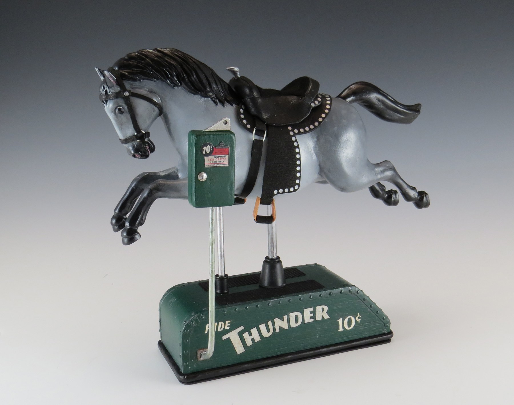 This little lady is reliving some fonder times as she climbs back in the saddle again. She has a wire armature under a fabric body with PaperClay sculpted head and limbs which are covered in cloth. The dress and shoes are original. The mechanical horse is his paper mache and PaperClay, painted with acrylic paints. The leather saddle was handmade after studying how saddles are made on YouTube.