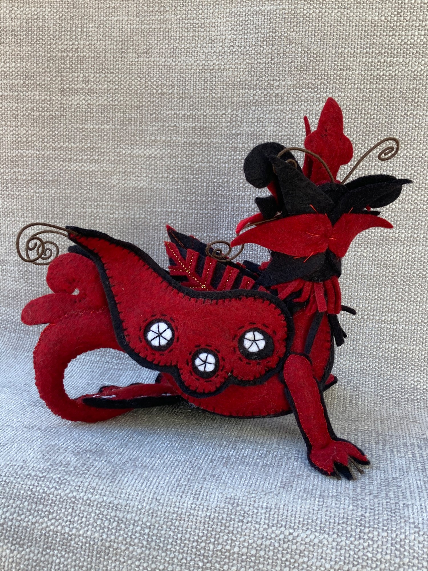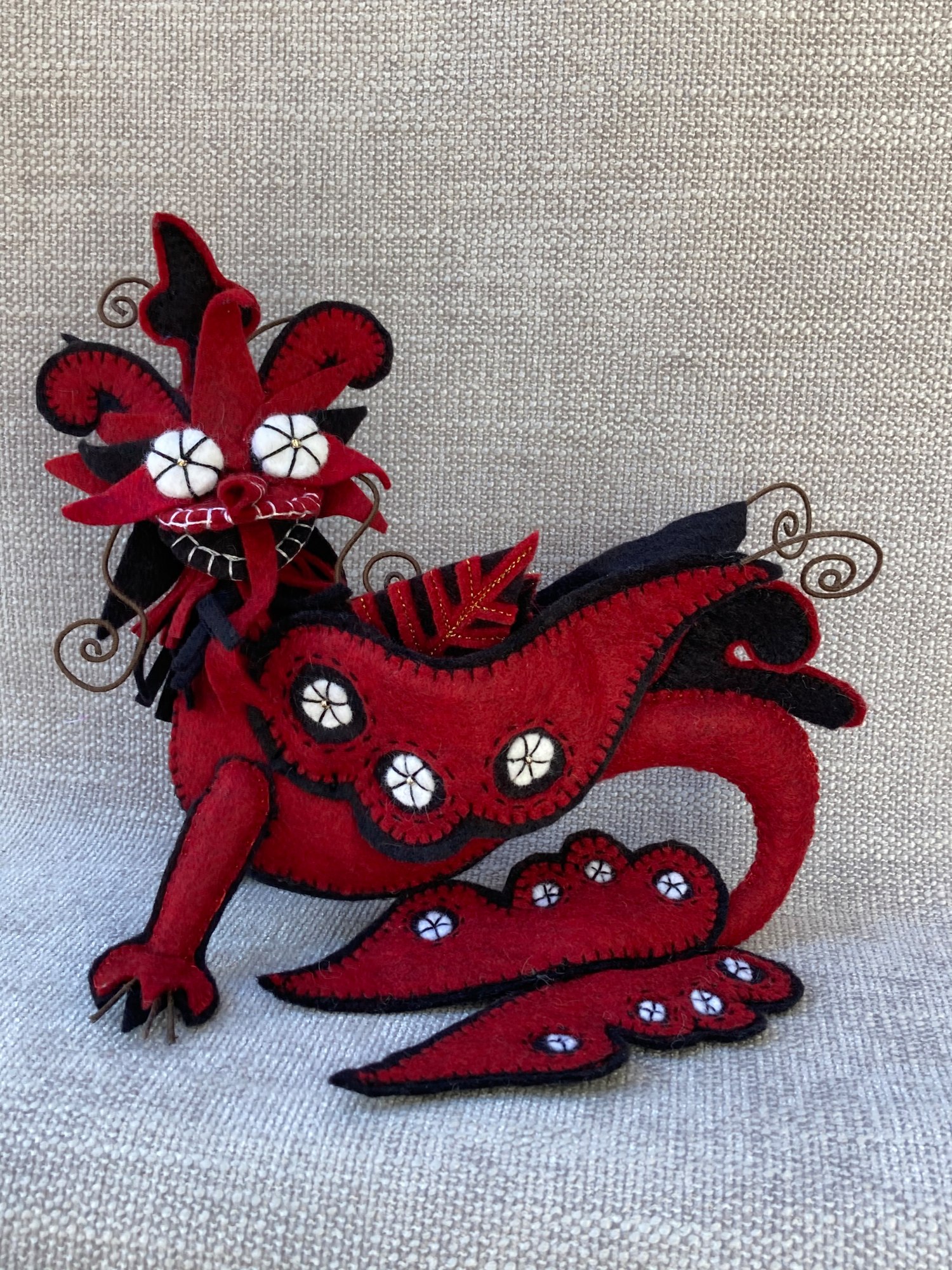 Wool blended felt dragon influenced from Chinese New Year dragons. Black, white and red body, wings and tail with reverse applique cut work touches. The Dragon stands on its own. . 7X6.5 inches.