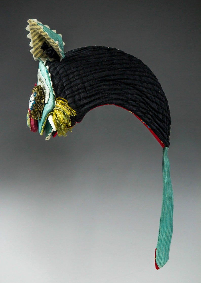 For the interior I used a red silk brocade that I had purchased when I was in China. Here again, balance, in color. The complementary or opposite color of aqua is a sherbet orange, I decided on Chinese red. I love the shock of red hidden beneath the black of the hat base.