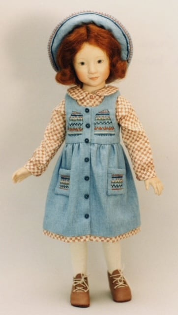 Emma Sophie is wearing a darling checked shirt under a pale blue denim jumper with peek-a-boo embroidery. A matching hat, cream stockings and lace-up leather boots complete her ensemble. She is 13” tall and has a jointed porcelain body, hand painted eyes and an auburn mohair wig. Emma Sophie is from my personal collection, and was one of three dolls presented to artist members at the NIADA Conference where I was voted in as a fellow artist member.