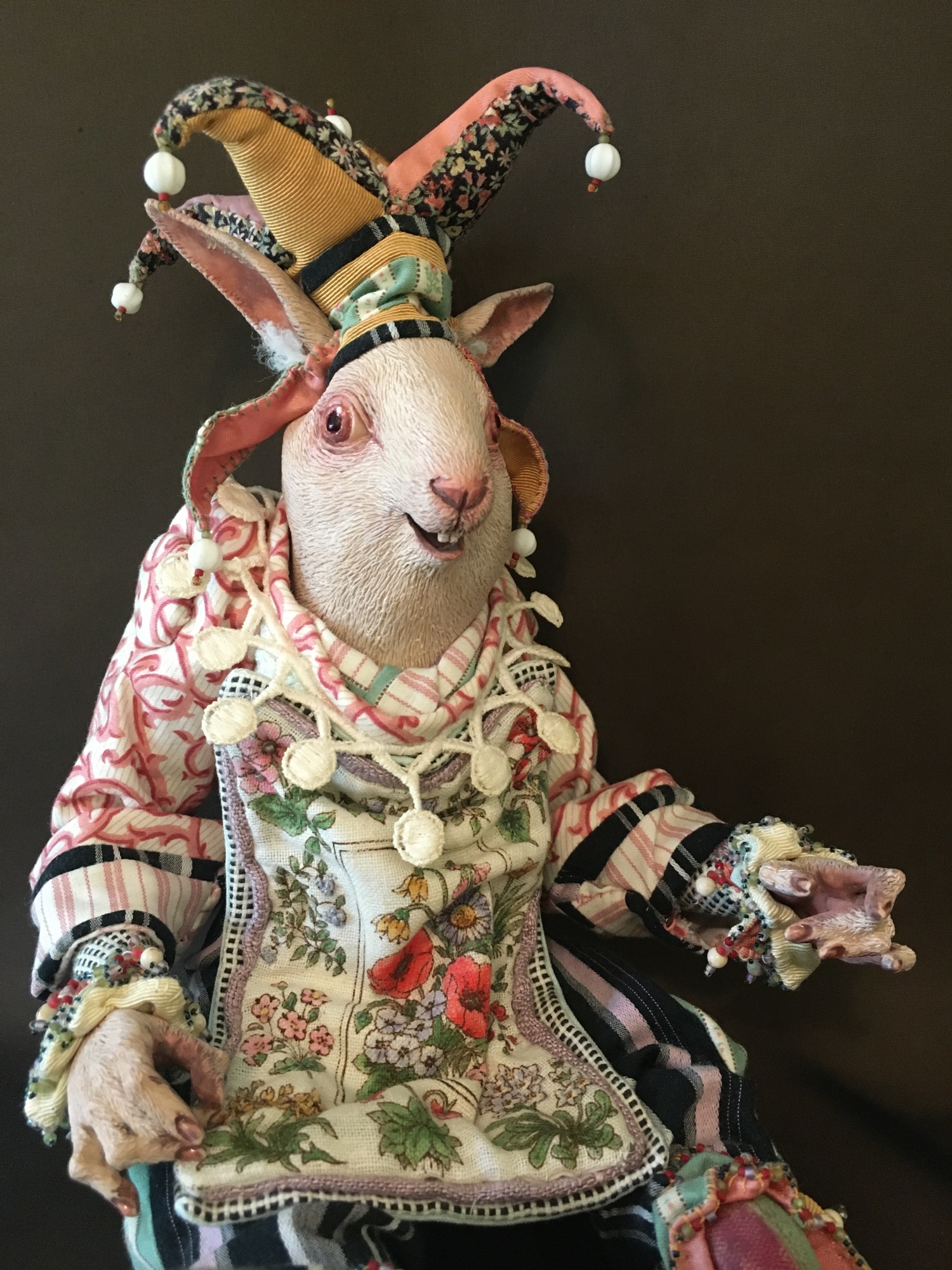 High-fire stoneware w/ceramic stains, sealed in 100% pure beeswax on articulated cloth body, costumed in vintage fabrics and embellished with glass beads. OOAK.