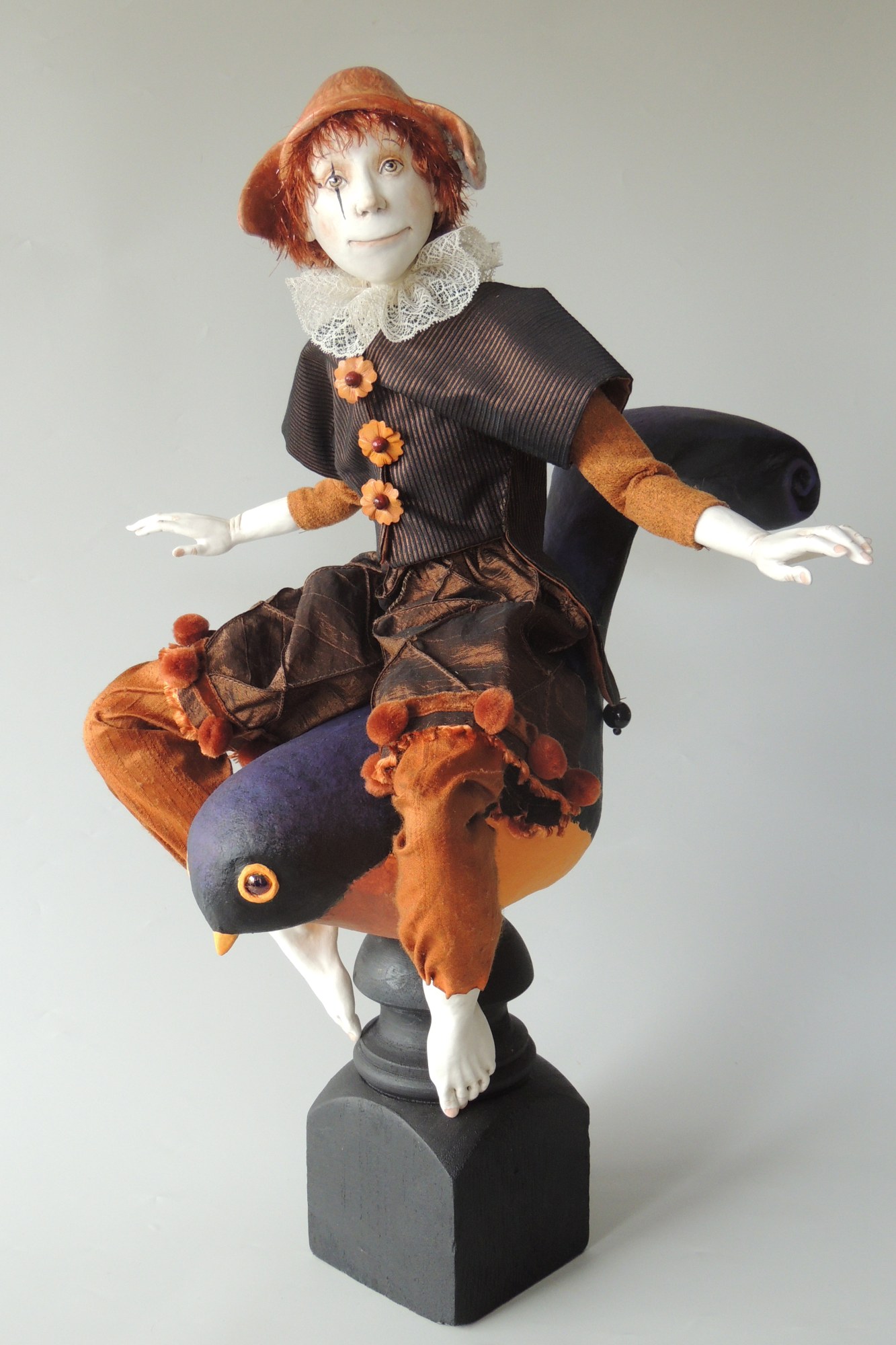 The doll is sitting on a bird. The bird is placed on a wooden stand. All parts are separate for easy transport. The arms of the doll are posable, the head can turn. OOAK1/1