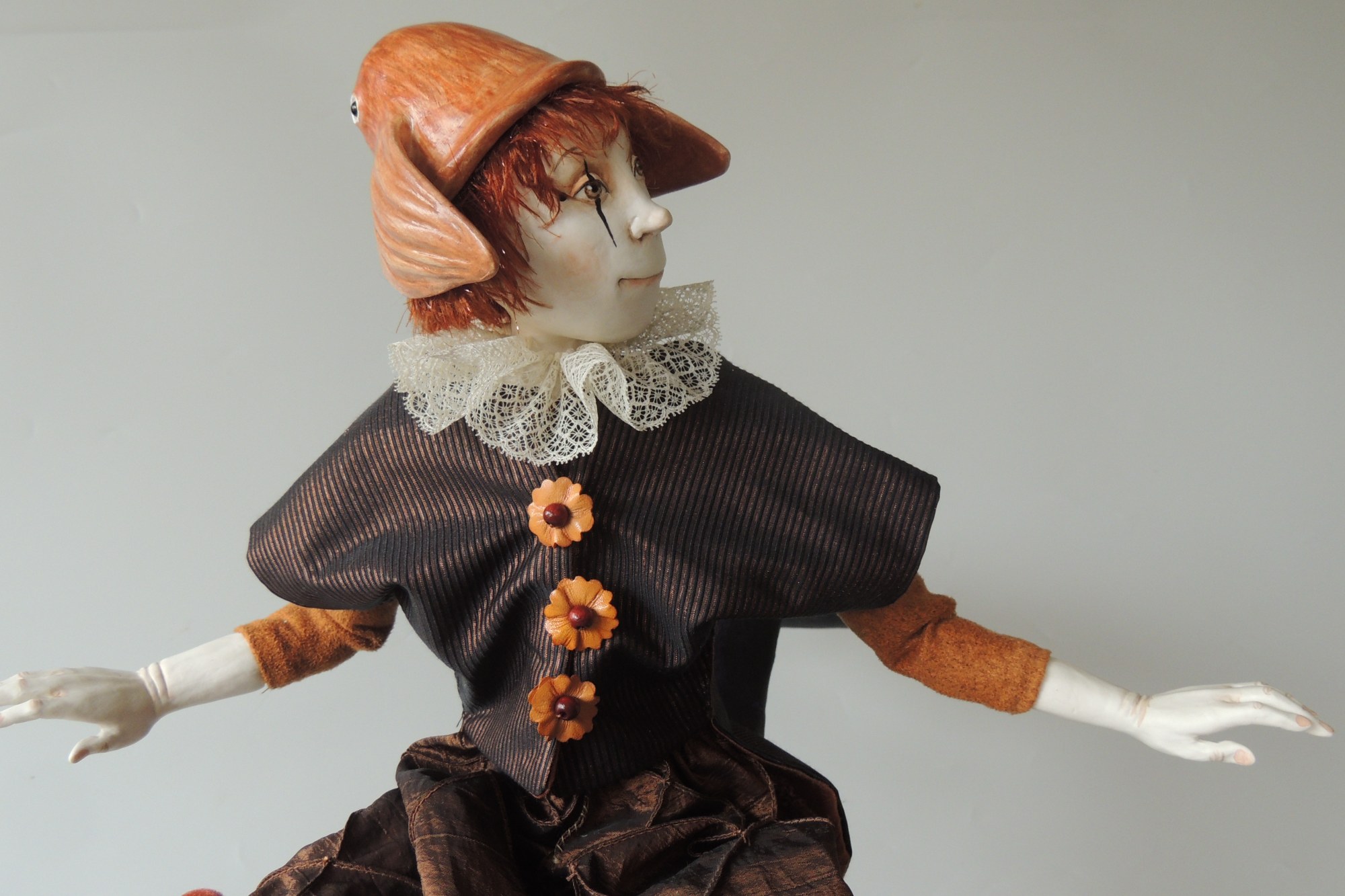 - Hand sculpted porcelain, papier mache, wood, textiles