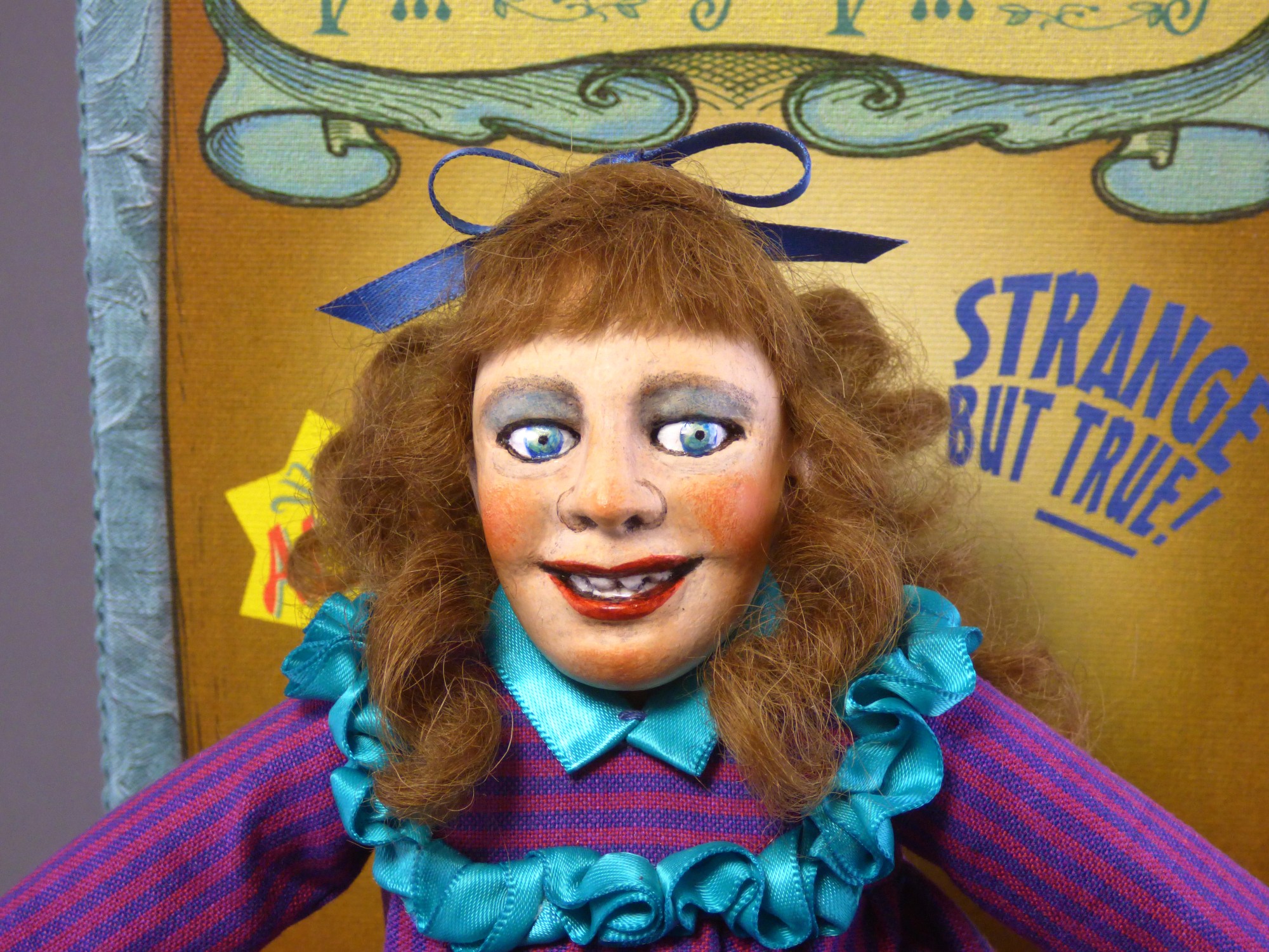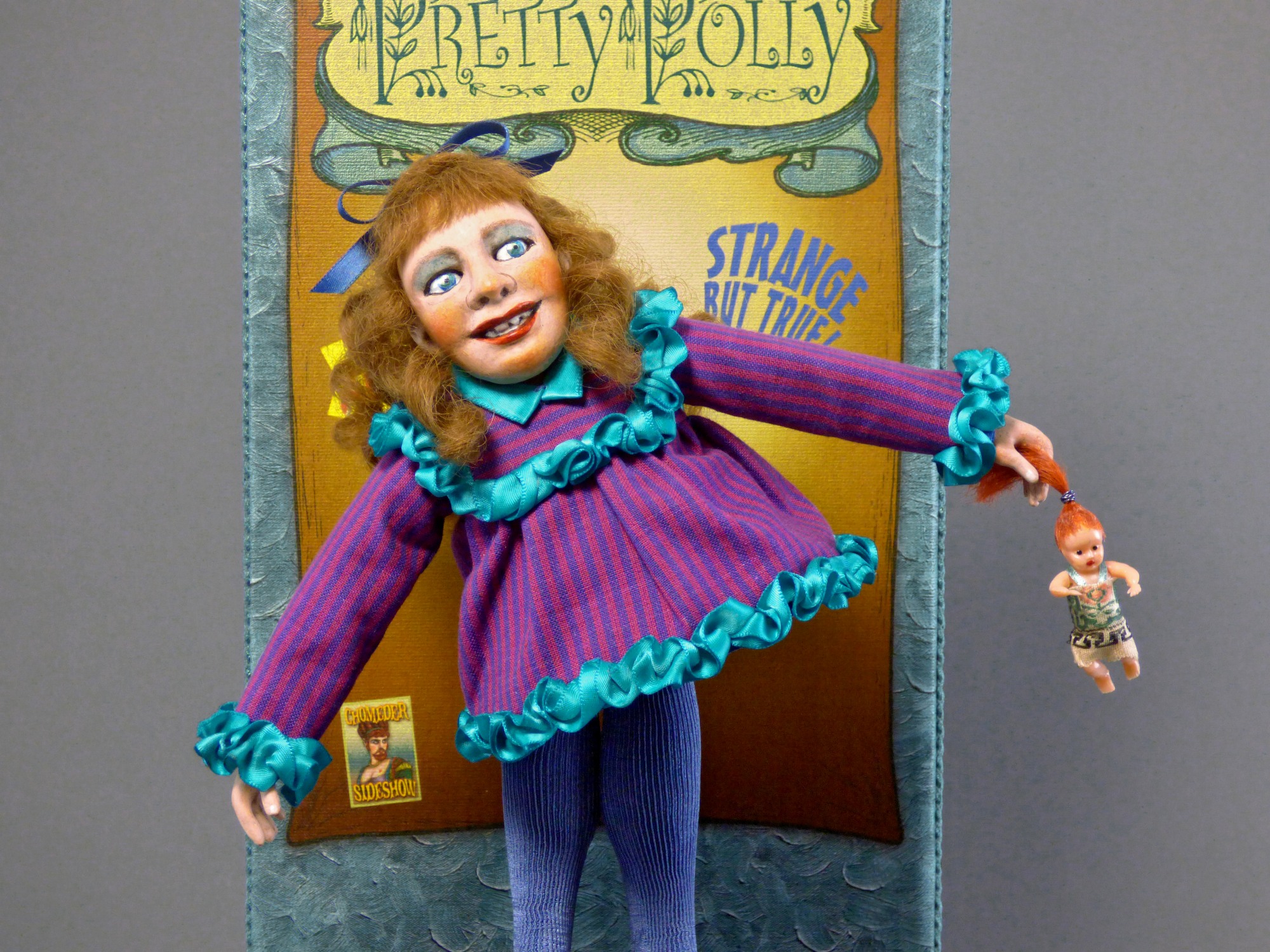MATERIALS: Wood, ABS thermoplastic, mohair, fabrics/trim, canvas art paper, 2″ miniature plastic doll.