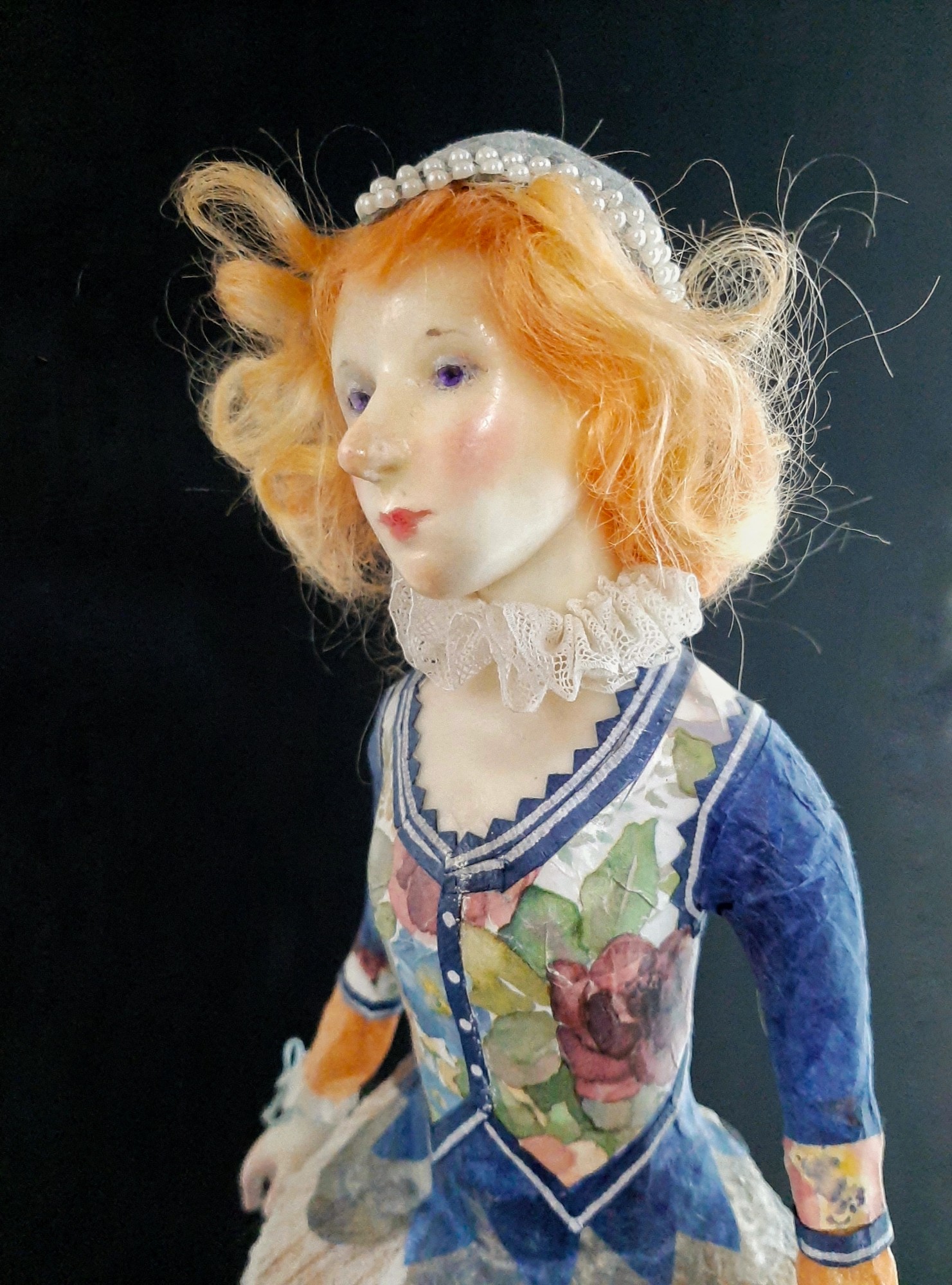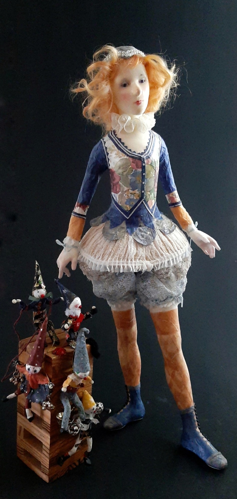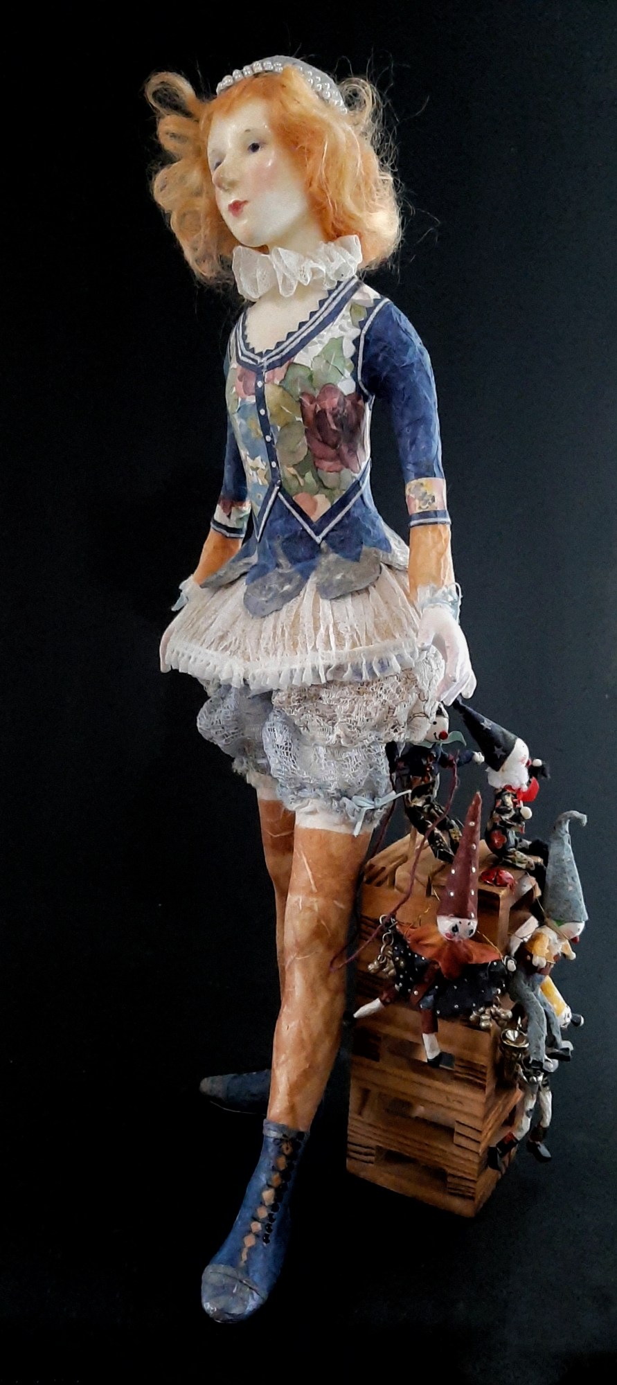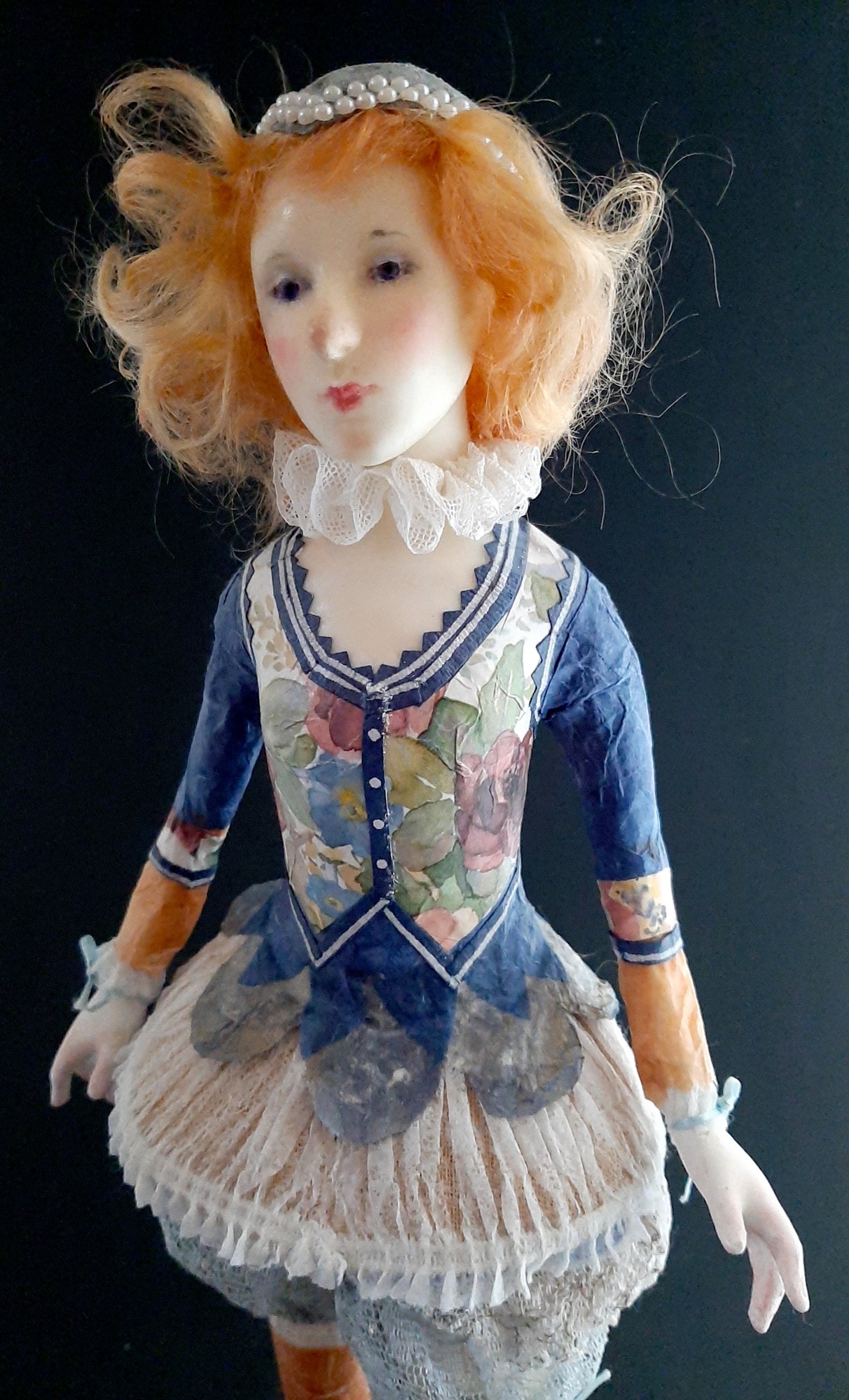 - Mixed media; Air-drying paper clay on a metal armature. Costumed in fabric and paper with a mohair wig.