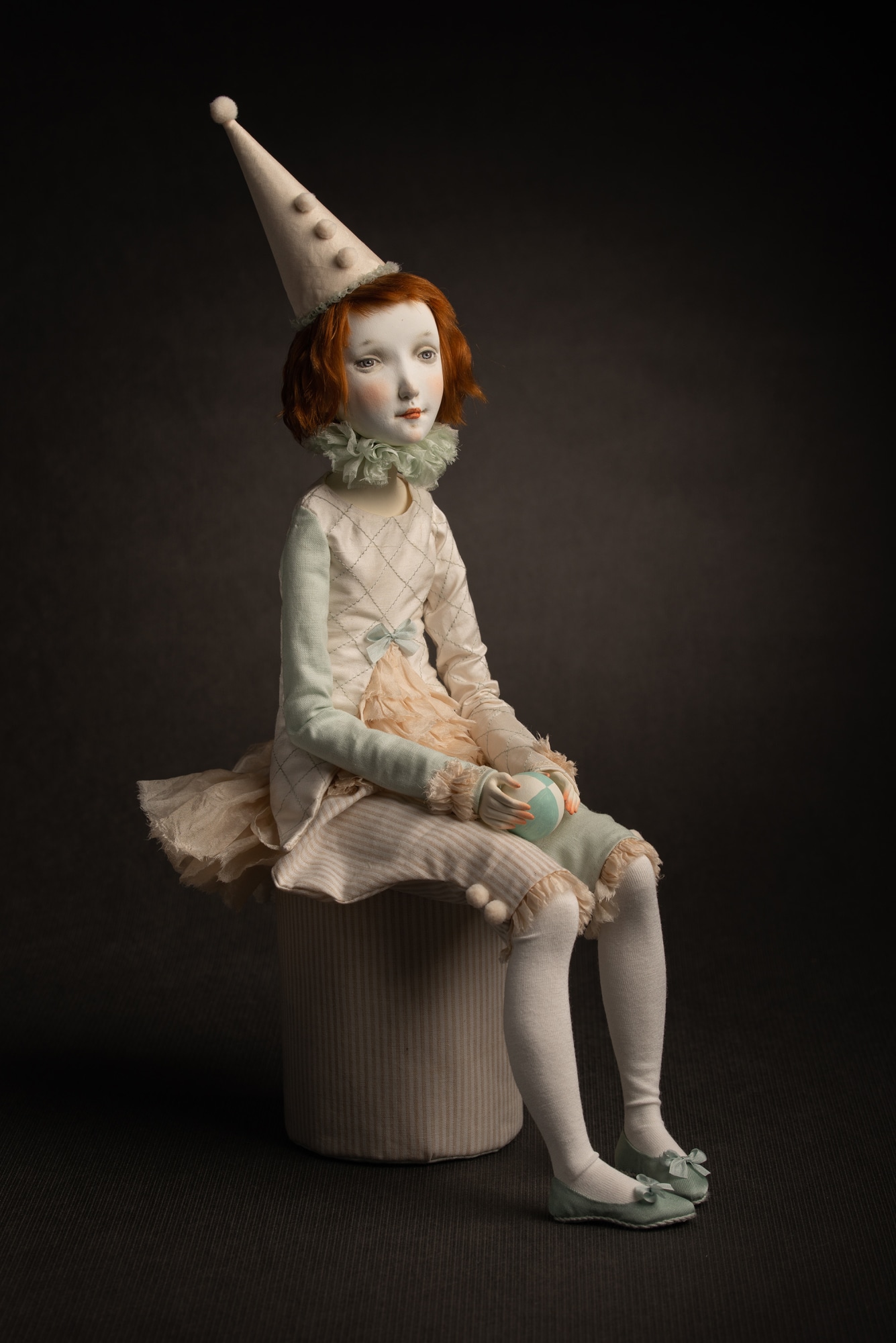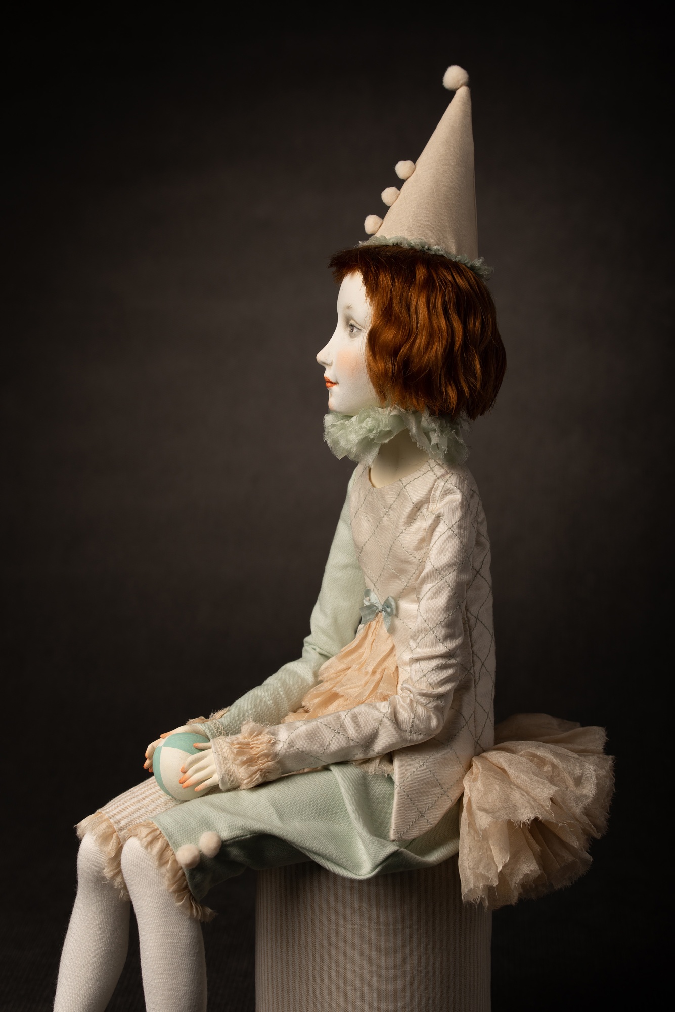 Hair is 100% wool mohair. Doll sits on decorated pedestal.
