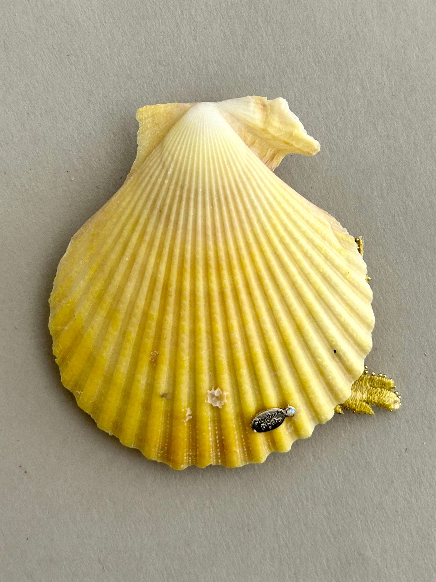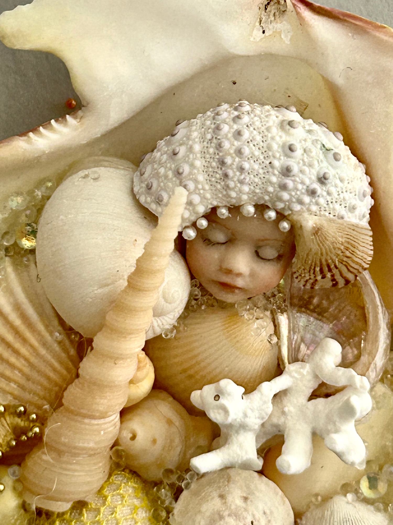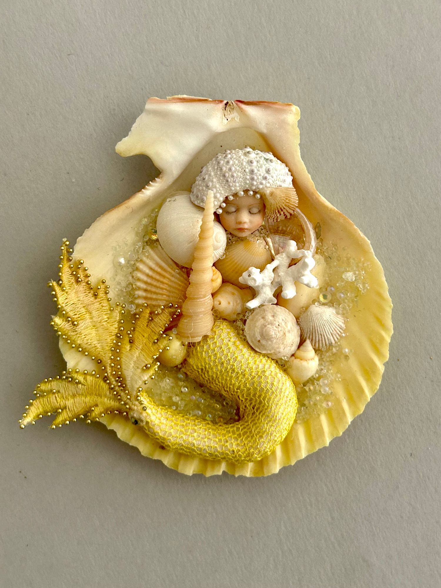 This Mini merbaby lies in a light yellow pectin shell blanketed with real seashells. The tail is hand dyed antique lace and fabric embellished with tiny Swarovski crystals and glass balls. The head is my original china painted porcelain with a sea urchin cap. Each is unique.