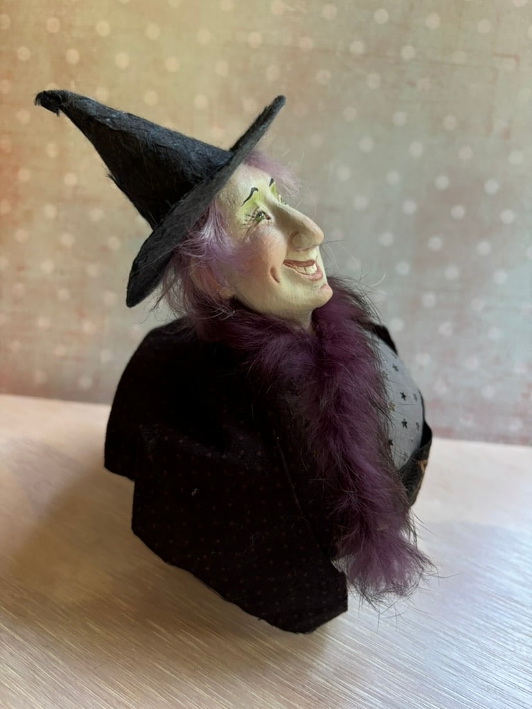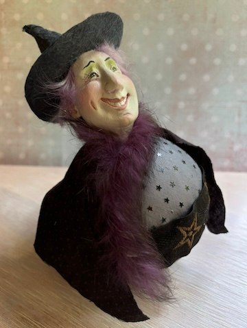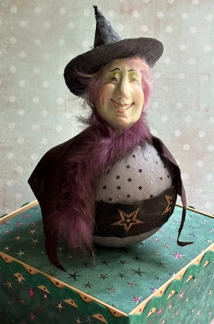 Stars witch is built on a weighted roly ball decorated with tiny black stars. She has a paper clay head, cloth cape, purple fur stole, lavender wig, rice paper witch hat and vintage star ribbon waist band. Give her a little push and she’ll rock and roll like a traditional roly poly toy. She comes packed in a decorated box which doubles as a stand for her display. The display box is 3.25 tall x 6.25 x 6.25” square covered in star fabric with rick rack trim. OOK Shipping is included. Shipping to US only.