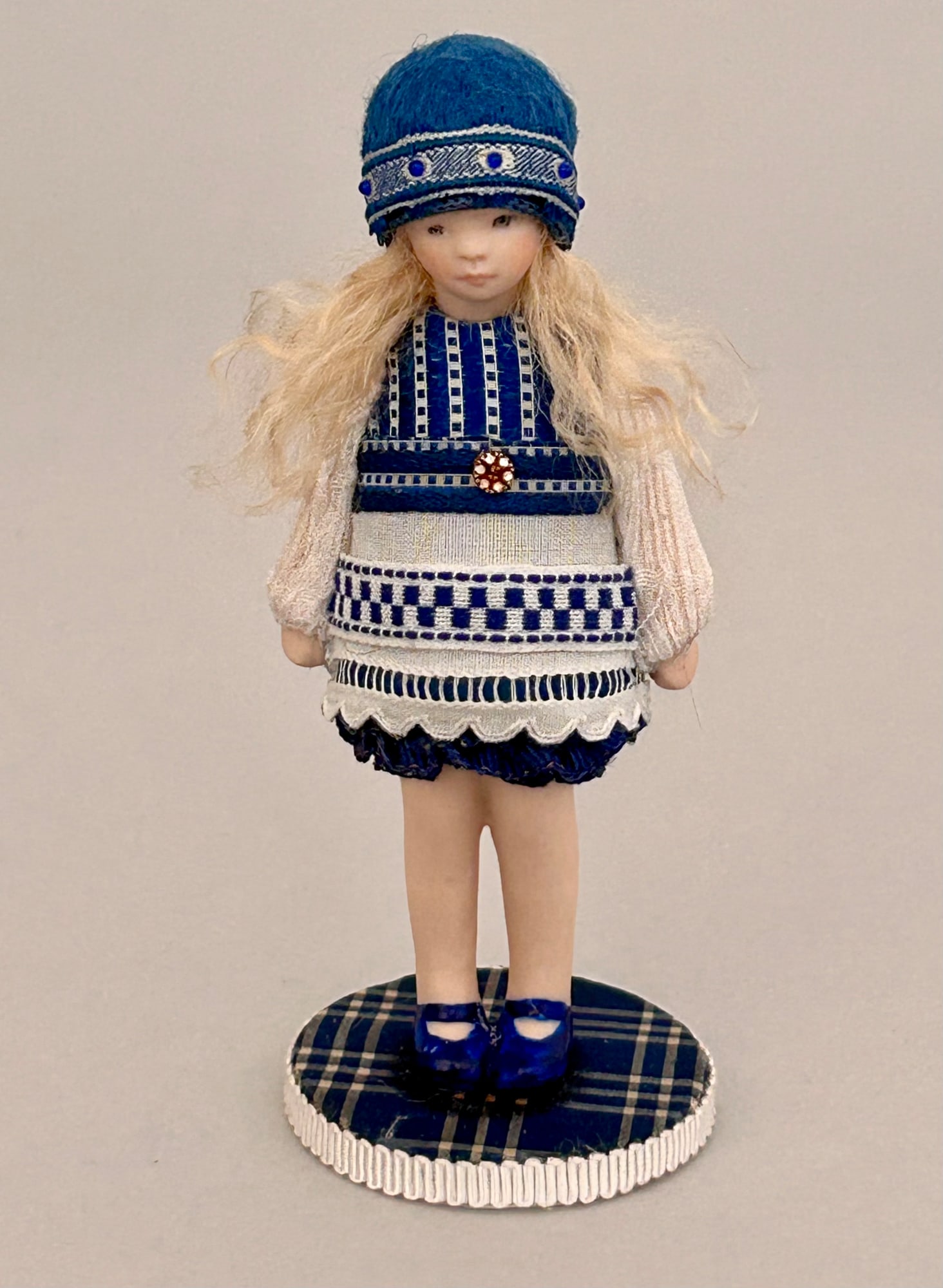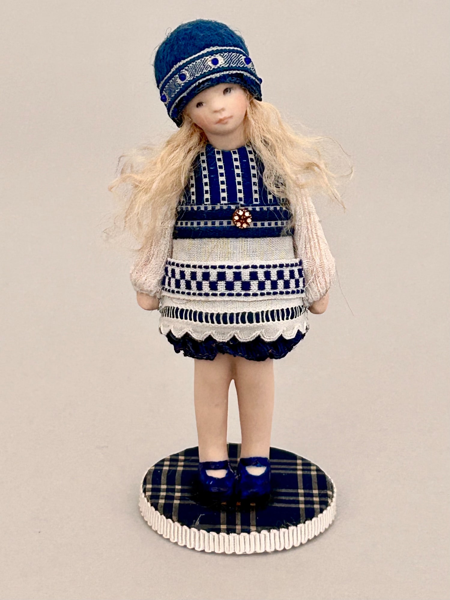 All porcelain with china painted face with moveable head. Dressed in antique 19th & 20th Century silk fabric samples embellished with antique, vintage & hand dyed trims. Wool felt hat and Tibetan lamb hair.