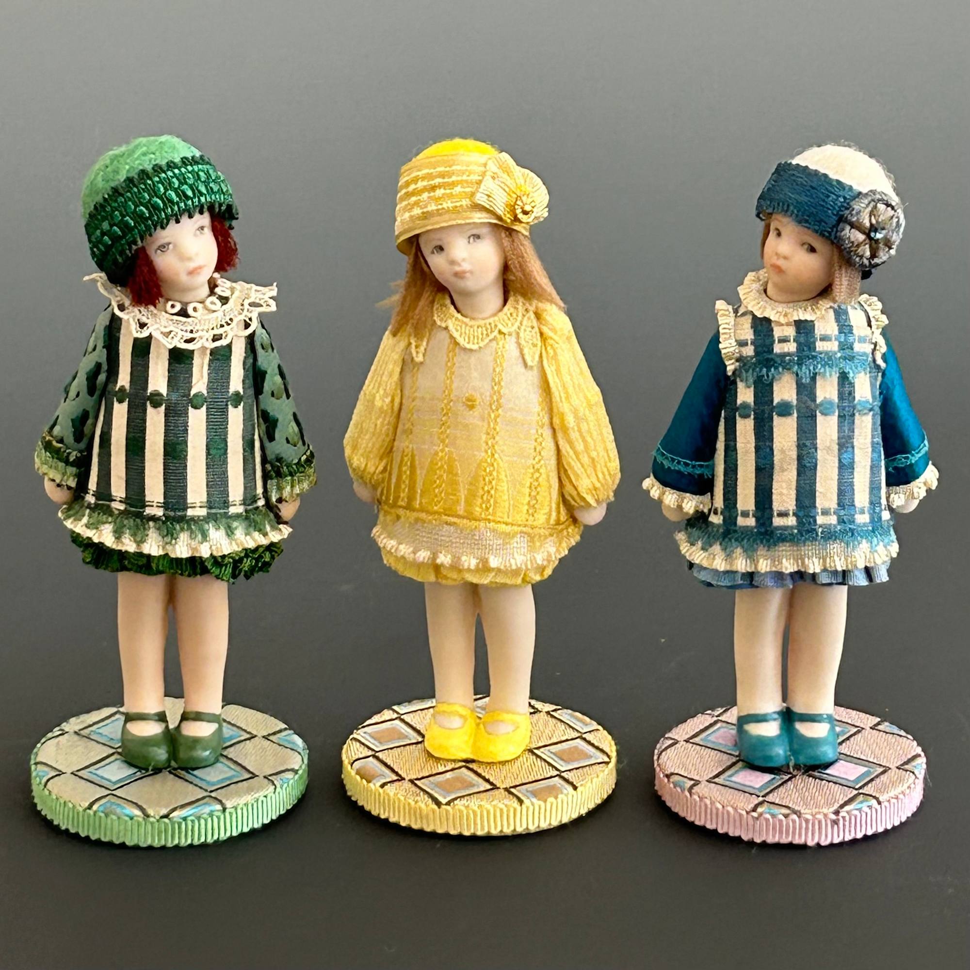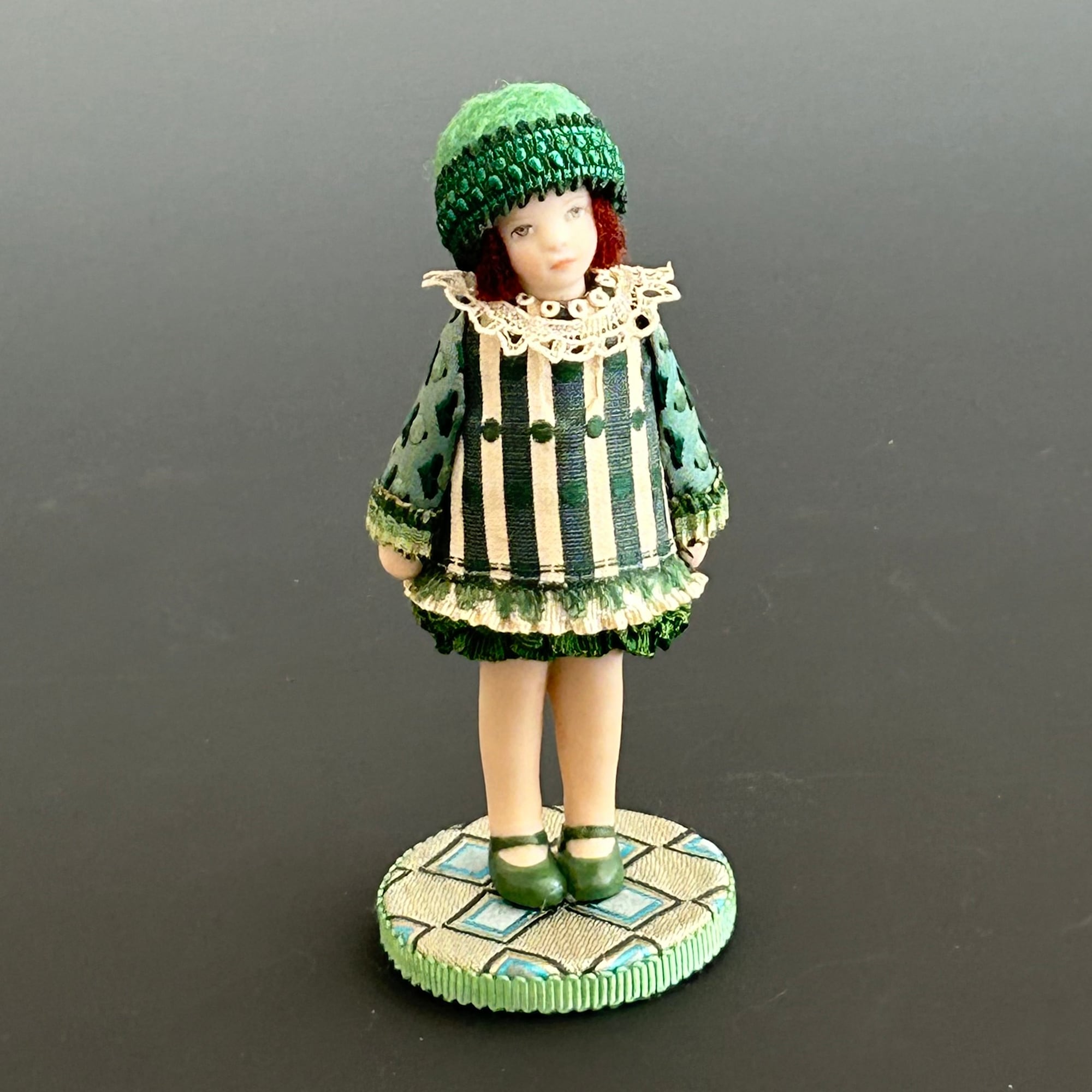 3.75" Tall .All porcelain with china painted face with moveable head. Dressed in antique 19th & 20th Century silk fabric samples embellished with antique, vintage & hand dyed trims. Wool felt hat and Tibetan lamb hair.
