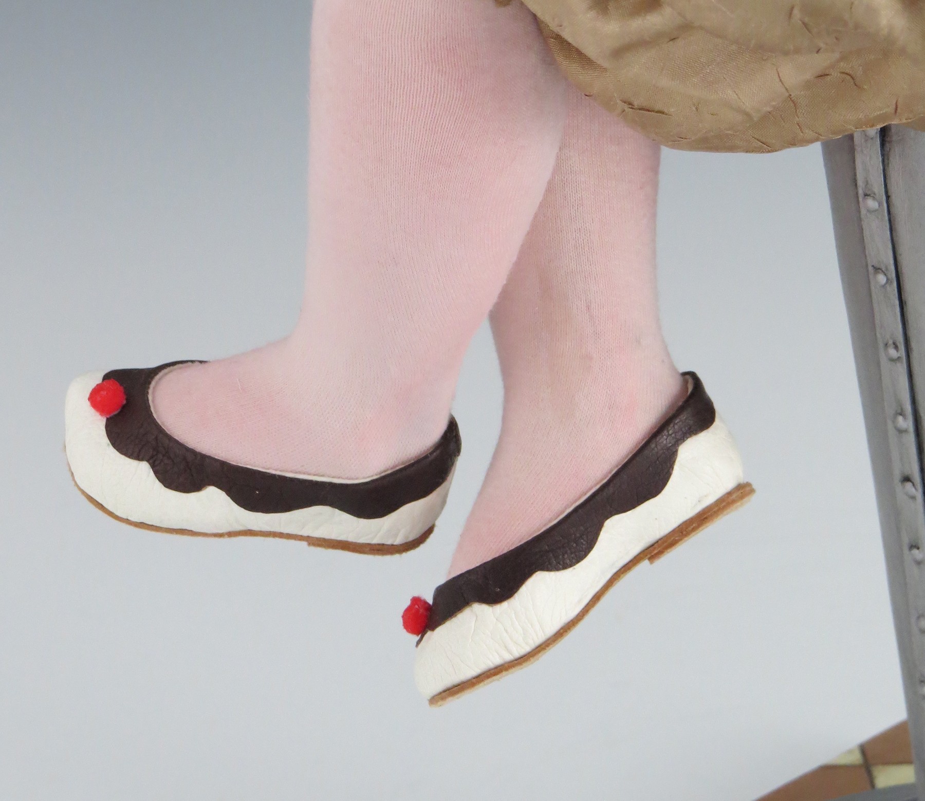 Because Tallulah likes ice cream, she loves her puffy pants! Those extra pounds are beautifully disguised as she sits on her favorite counter stool. She has a wire armature with a cloth torso and sculpted cloth-covered PaperClay limbs and head. the ice cream is sculpted as well. Her little sundae shoes are made from vintage leather gloves. The stool is paper and wood.