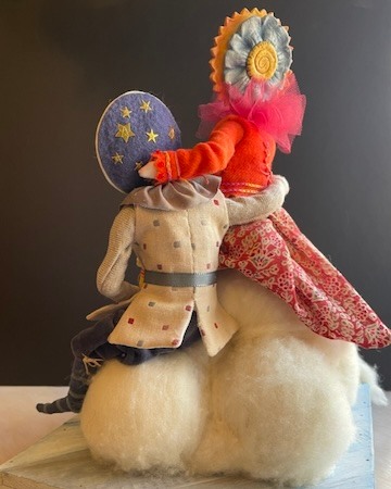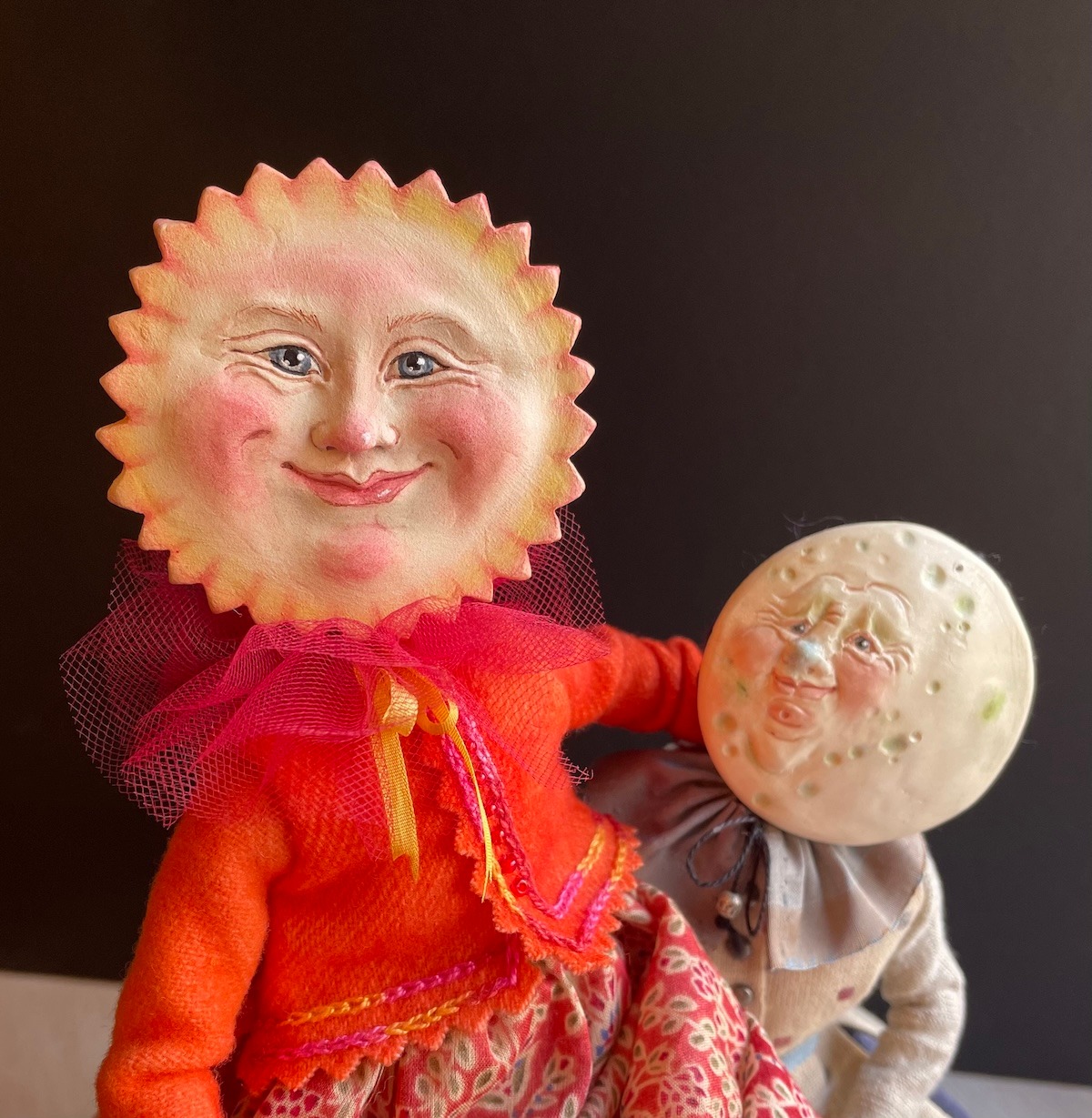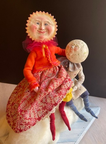 The Sun and moon are favorite topics this time showing their loving attachment to each other. Each figure is mixed media/Creative Paperclay dressed in wool, cotton and velvet siting on a needle felted wool cloud. The Moon is cast Flumo, both on wire armatures with padded cloth bodies. The sky blue wood base has a line of poetry on each side referencing the four seasons. After all we hold the sun and moon responsible for the constant change of season. OOAK Shipping included to US only