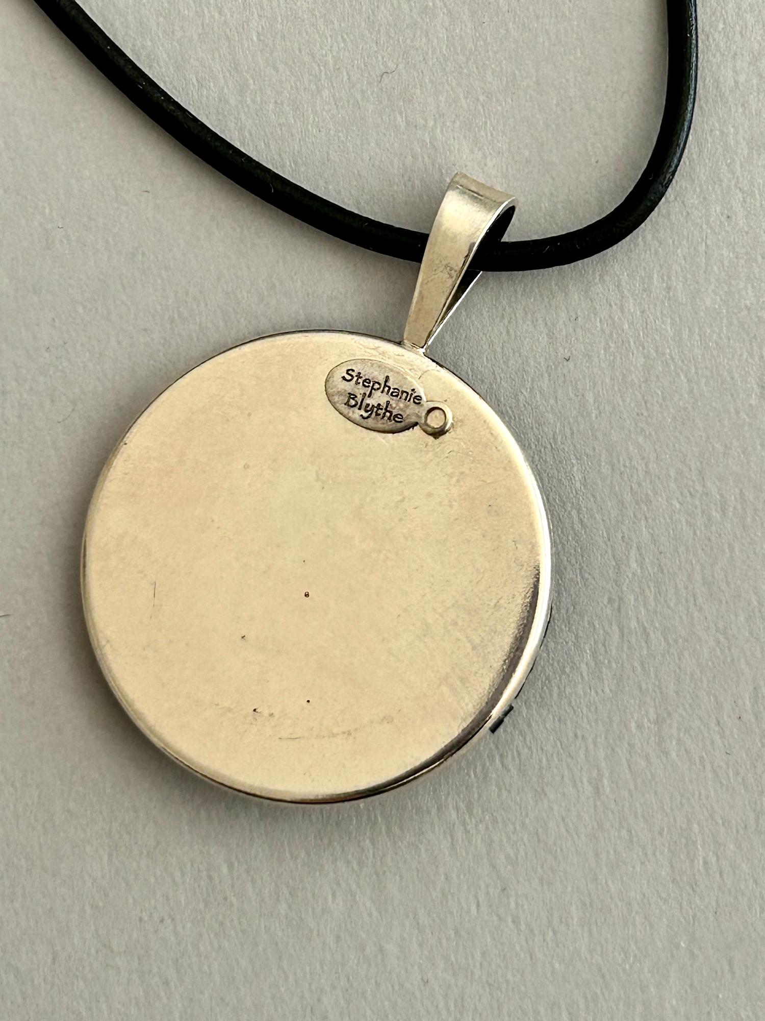 A china-painted face gazes out from a background of iridescent abalone, set in a sterling silver pendant bezel. Her face is embellished with an opal, antique Chinese mother-of-pearl carvings, and iridescent glass beads. The pendant is suspended from a leather necklace.