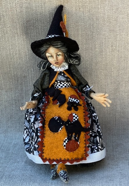 This Halloween themed doll can be displayed on the wall or seated in a chair or a wide candle holder. Cotton fabric body, wool stuffing. Features created with acrylic paint, pigma pen, Prisma color pencils. Lips, eyebrows, lids, flair of nostrils hand stitched with Gutterman’s and Sulky thread. Highlight and shadow create depth. The apron has a circular cutwork design.in wool felt in rusty oranges, gray, white and black. Black cats and pumpkins are placed in a vertical pattern. She wears a black felt vest with a marigold narrow border. Black pointed felt hat has leaf shapes and metallic thread placed at the side of the hat. Black sparkle tulle slip is under the skirt. Hair is two colors of fine black and gray mohair yarn, sewn into flowing loops. Fabric shoes are a companion print pattern in the dress. 16 inches from the tip of the toe to the point of the hat.