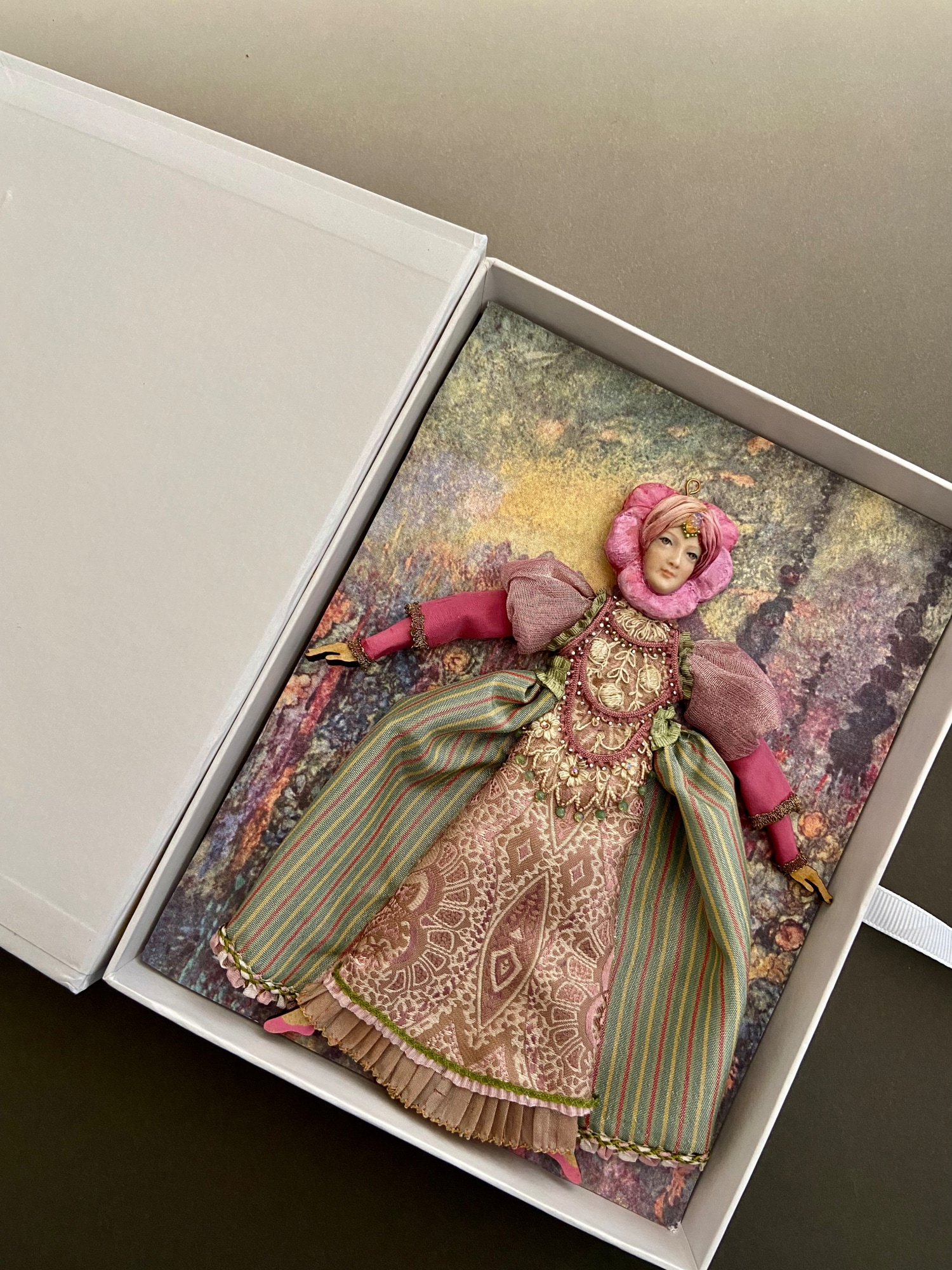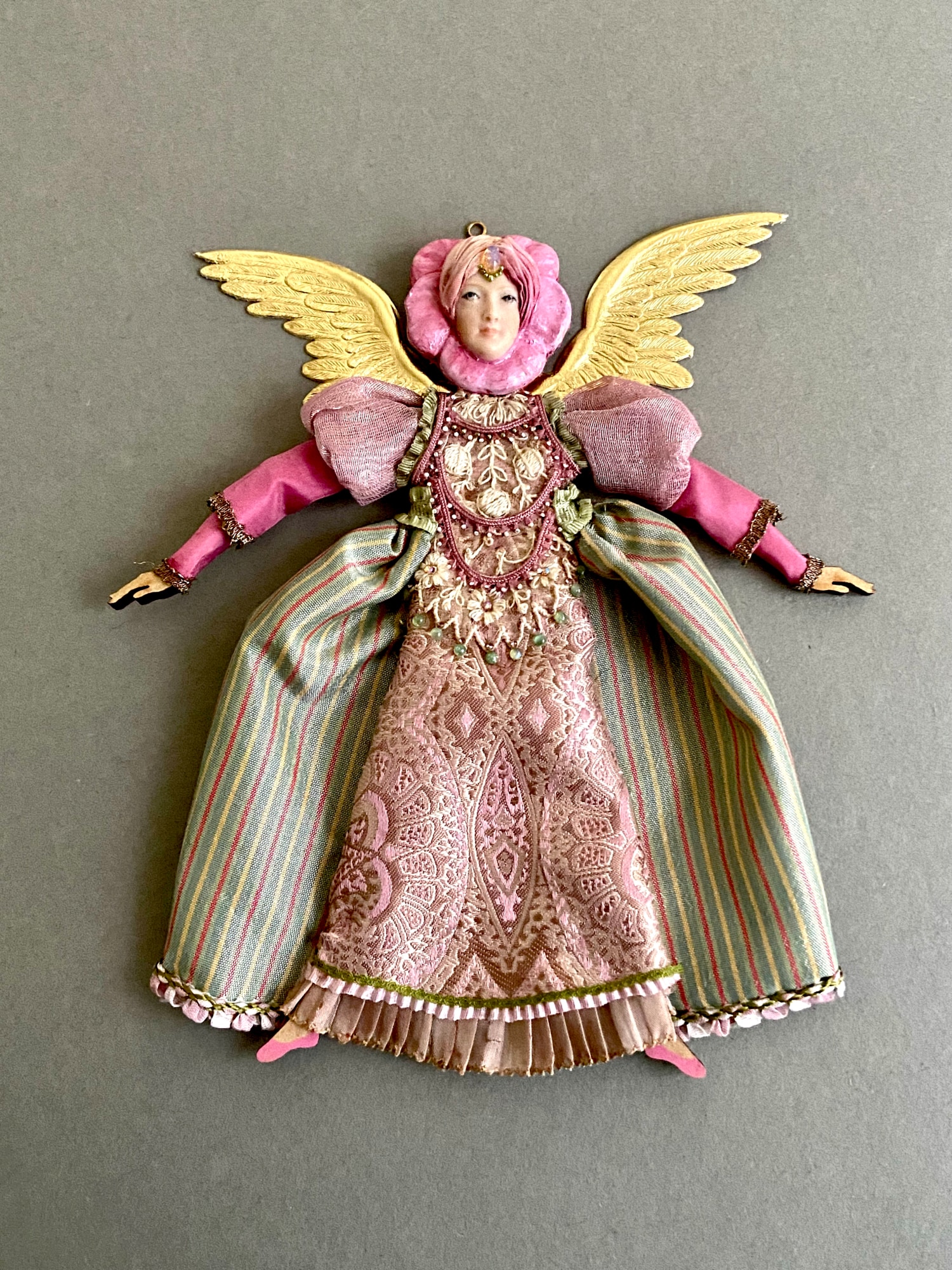 Articulated laser cut wooden body with a china painted pansy head dressed in antique & vintage textiles embellished with Swarovski Austrian Crystals. Removable gold foil wings. Small hanger at top. Packaged in a special presentation box.