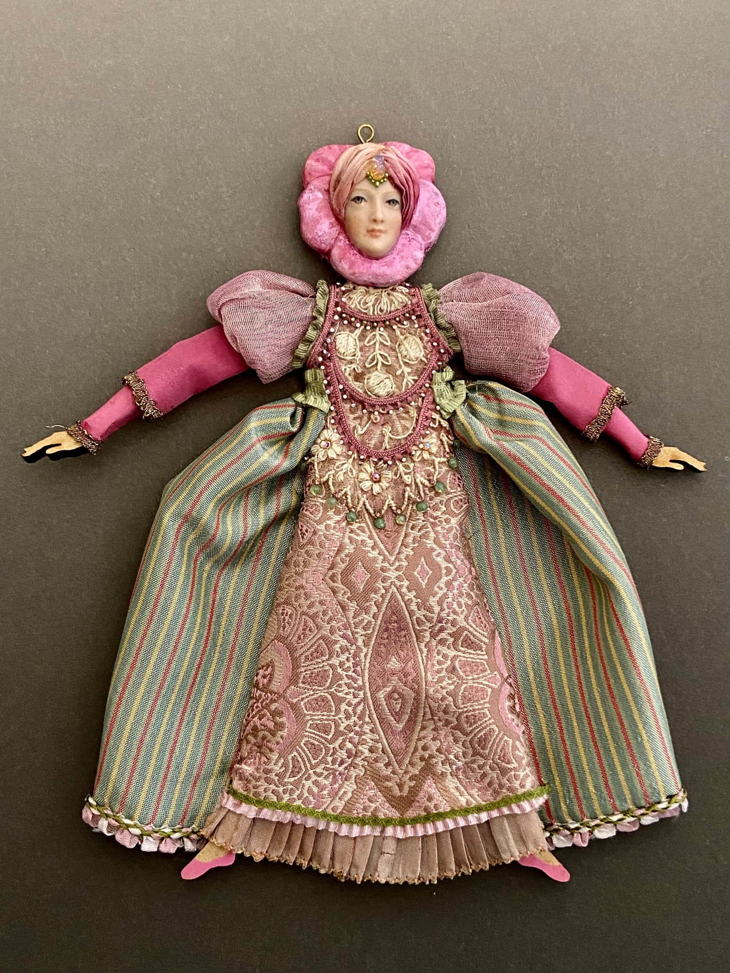 Articulated laser cut wooden body with a china painted pansy head dressed in antique & vintage textiles embellished with Swarovski Austrian Crystals. Removable gold foil wings. Small hanger at top. Packaged in a special presentation box.