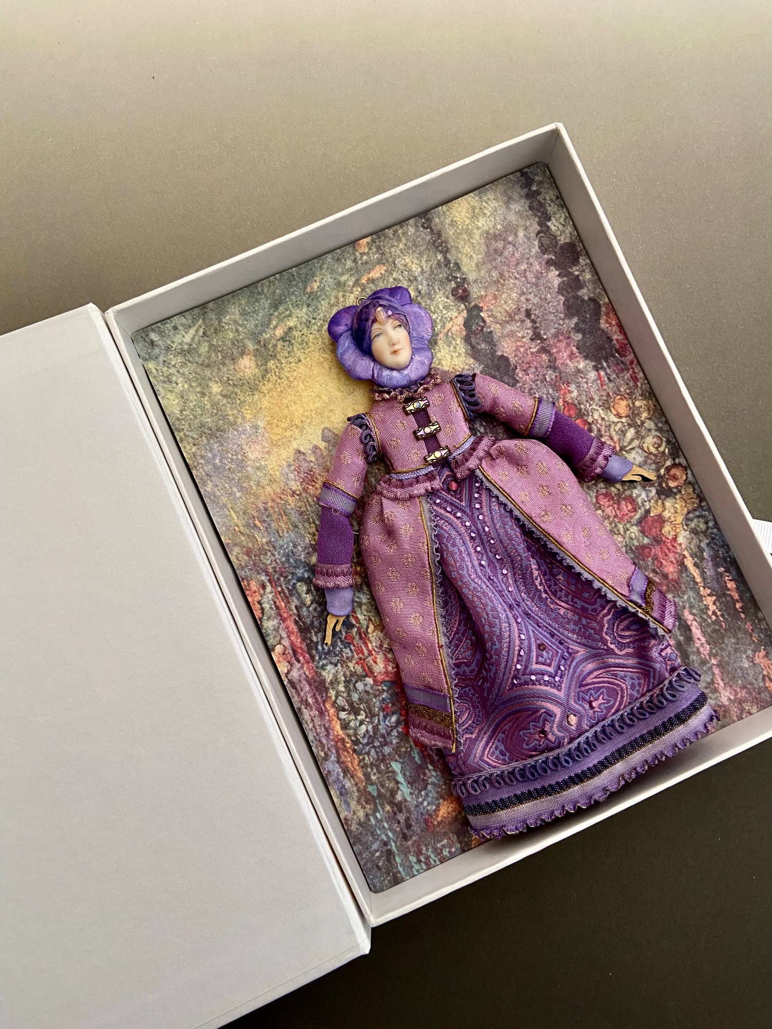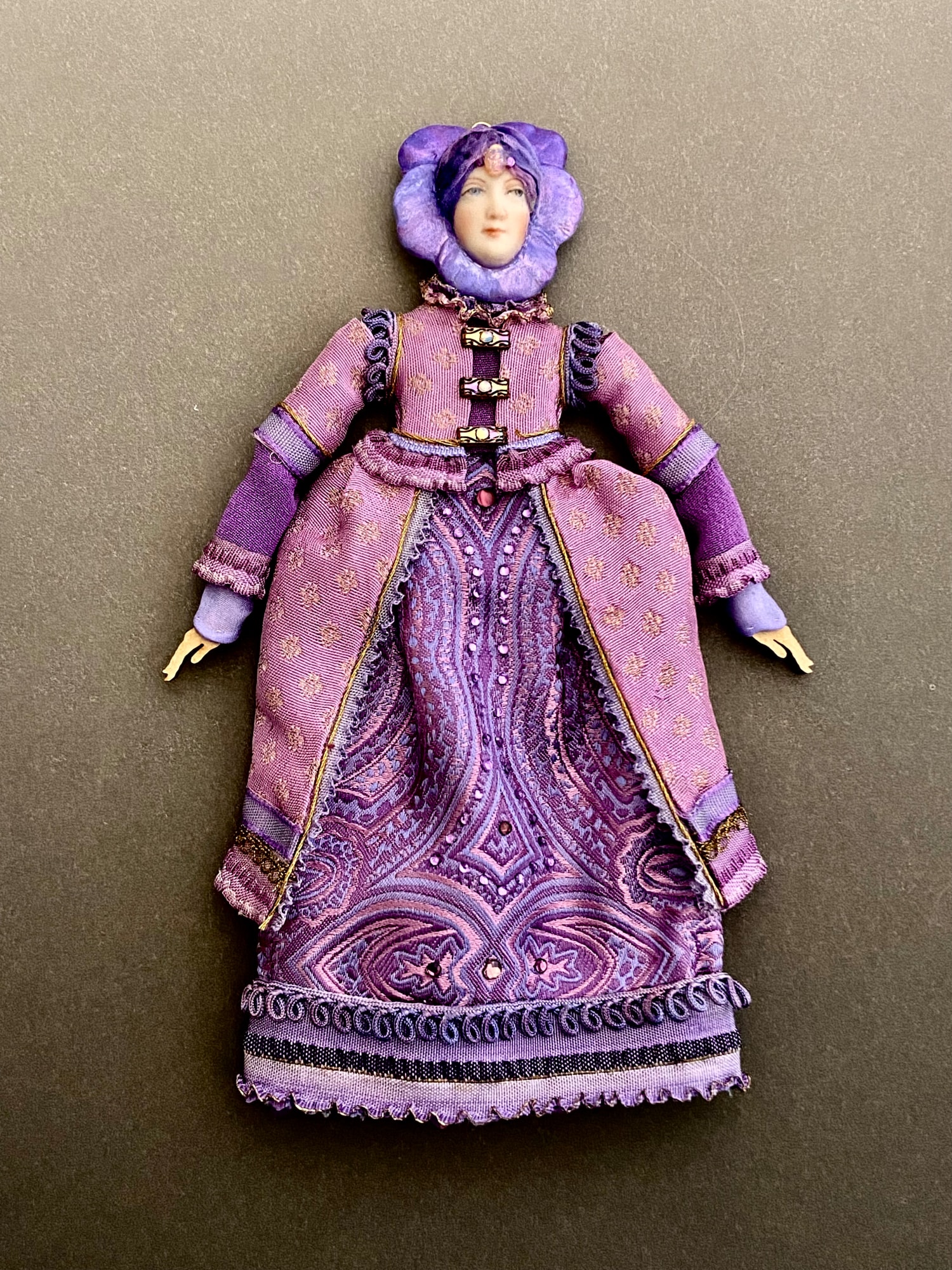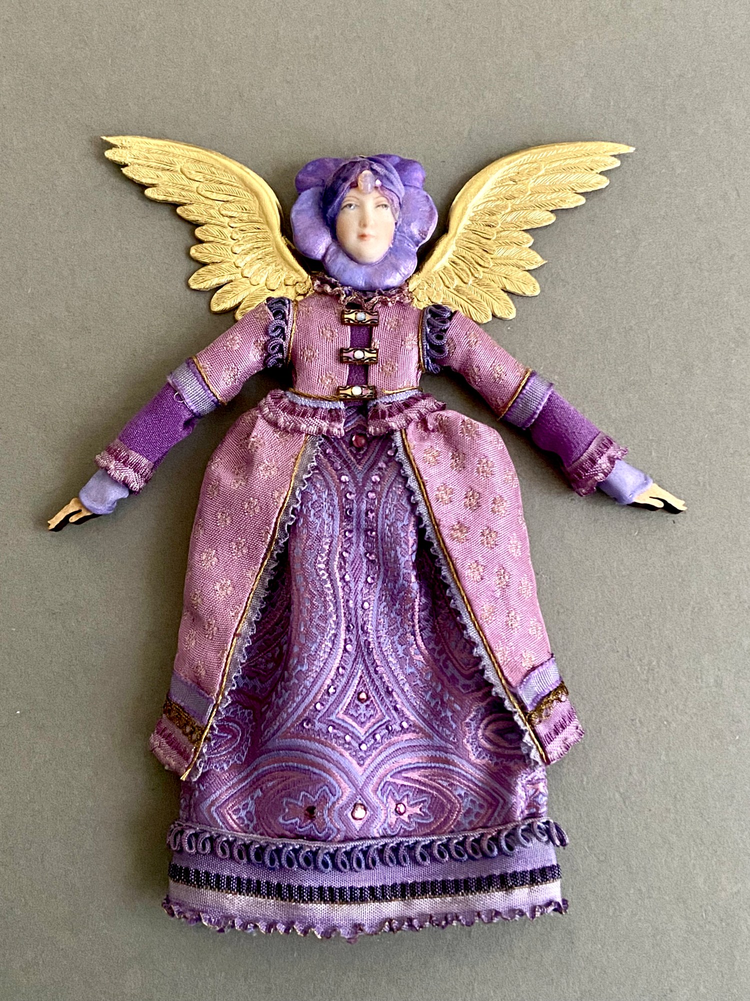 Articulated laser cut wooden body with a china painted pansy head dressed in antique & vintage textiles embellished with Swarovski Austrian Crystals. Removable gold foil wings. Small hanger at top. Packaged in a special presentation box.