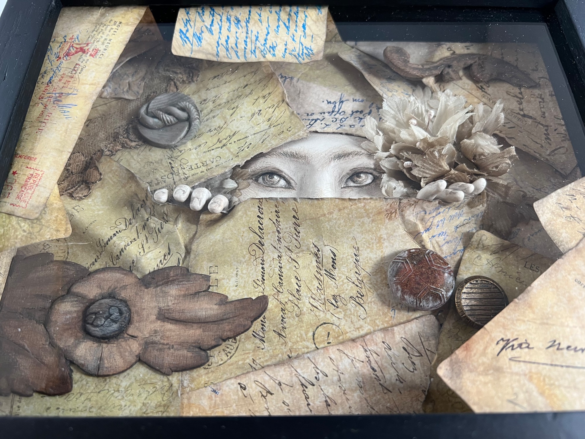 Sculpted and painted facial features surrounded with paper collages, vintage and antics accents: buttons, carved wood and textile.