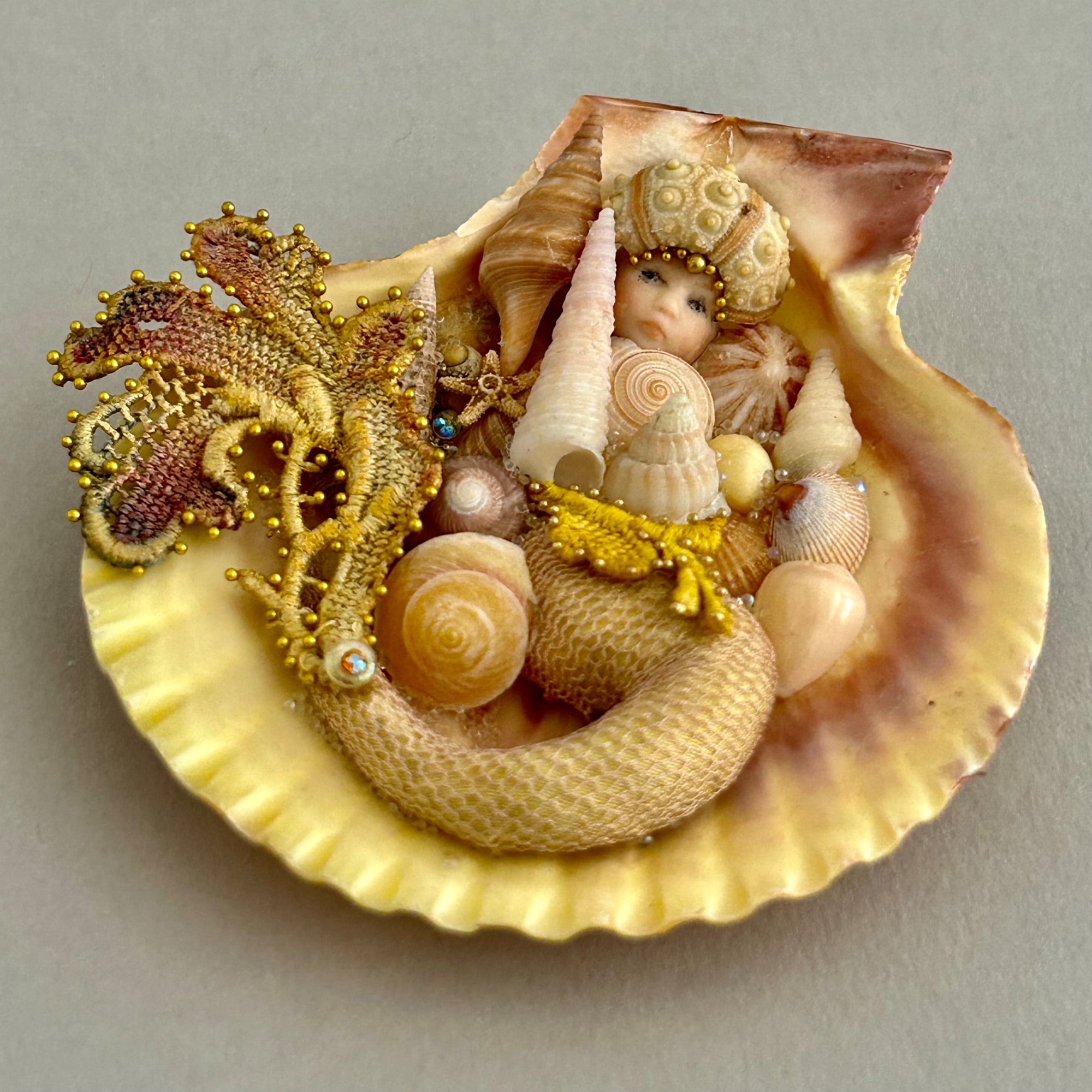 This Mini merbaby lies in an yellow pectin shell blanketed with real seashells. The tail is hand dyed antique lace and fabric embellished with tiny Swarovski crystals and glass balls. The head is my original china painted porcelain with a sea urchin cap. Each is unique.