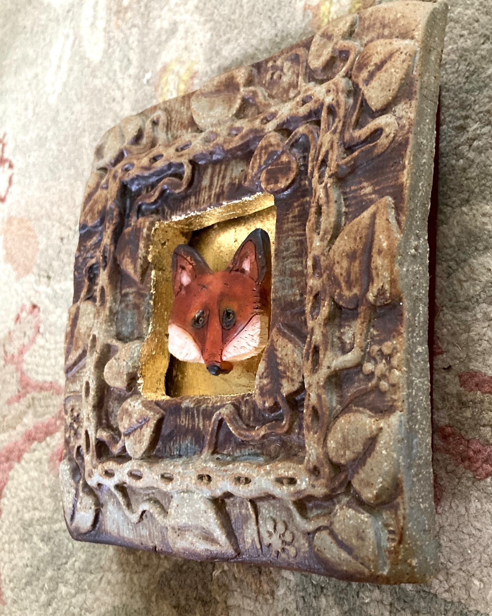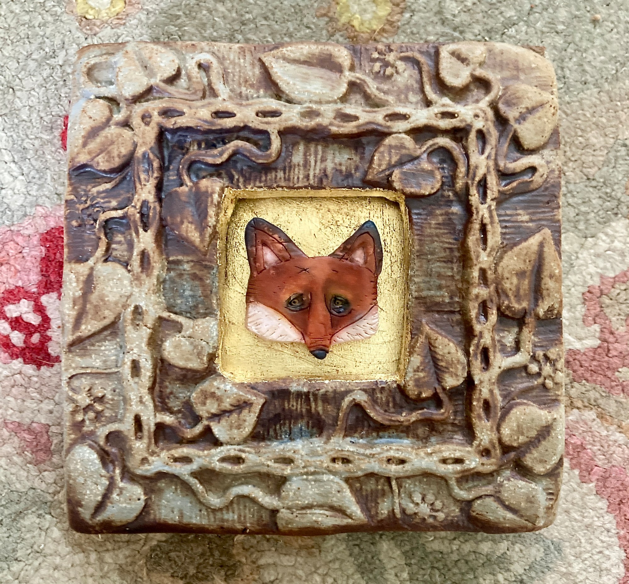 Co-created by myself and my husband Bradley Wiseman. Brad made the ceramic frame and I created the watchful fox . . .