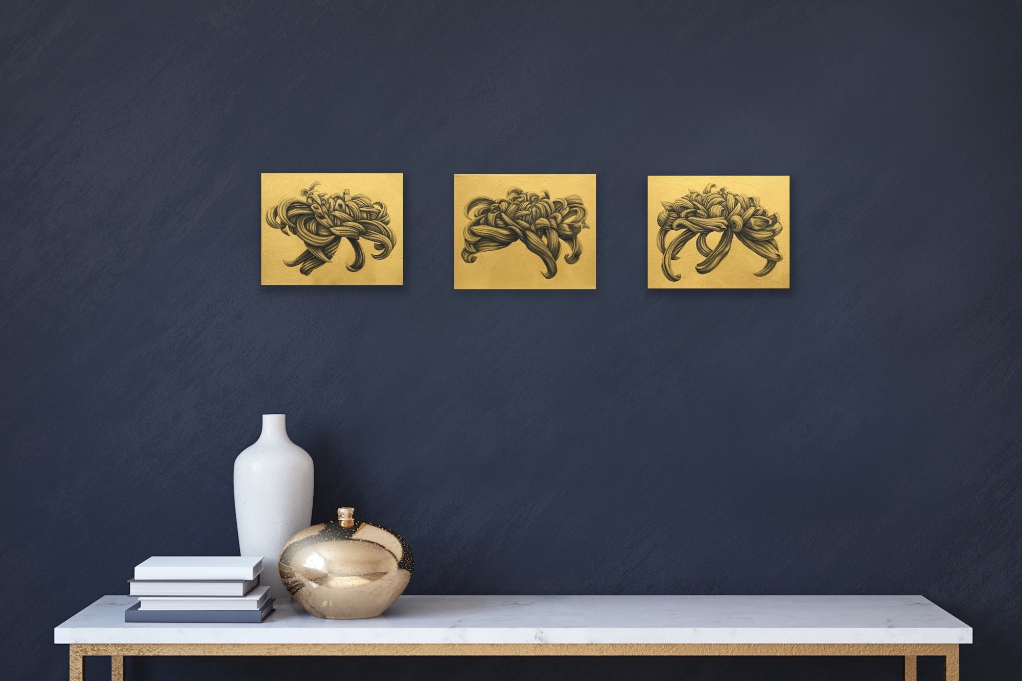 This piece is part of a triptych of chrysanthemum portraits that focus on the beauty of the irregular form. The graceful and unique structure of these chrysanthemums refuse to comply with the standard definition of beauty. The gold background and monochrome bloom make this an unforgettable piece.
