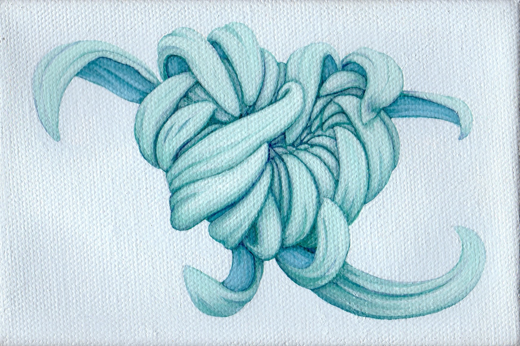 This is the eighth piece of this collection of floral portraits in topaz blue-greens which can be collected in a group or as single pieces. Each painting reflects an unruly and unique bloom on a lightly blue tinted background (the same color throughout the collection) and the petals of each flower have a slightly different color on the inner surface.