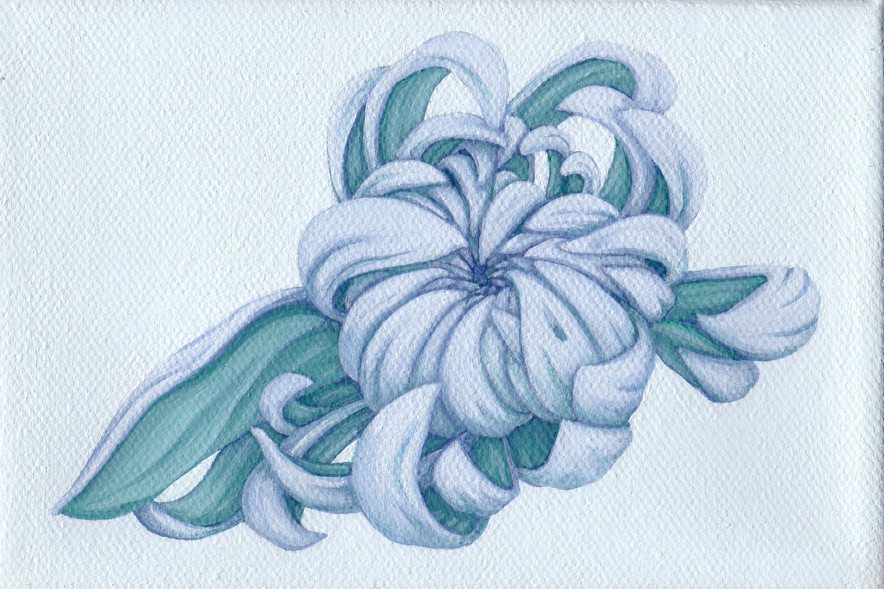 This is the tenth piece of this collection of floral portraits in topaz blues which can be collected in a group or as single pieces. Each painting reflects an unruly and unique bloom on a lightly blue tinted background (the same color throughout the collection) and the petals of each flower have a slightly different color on the inner surface.