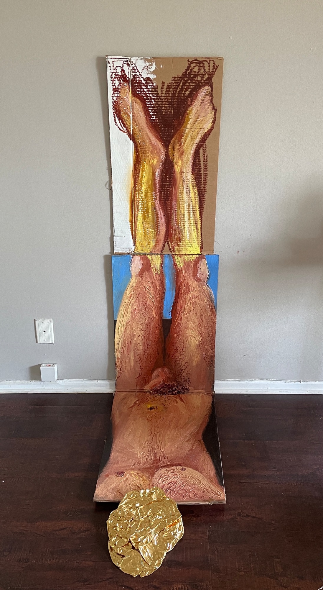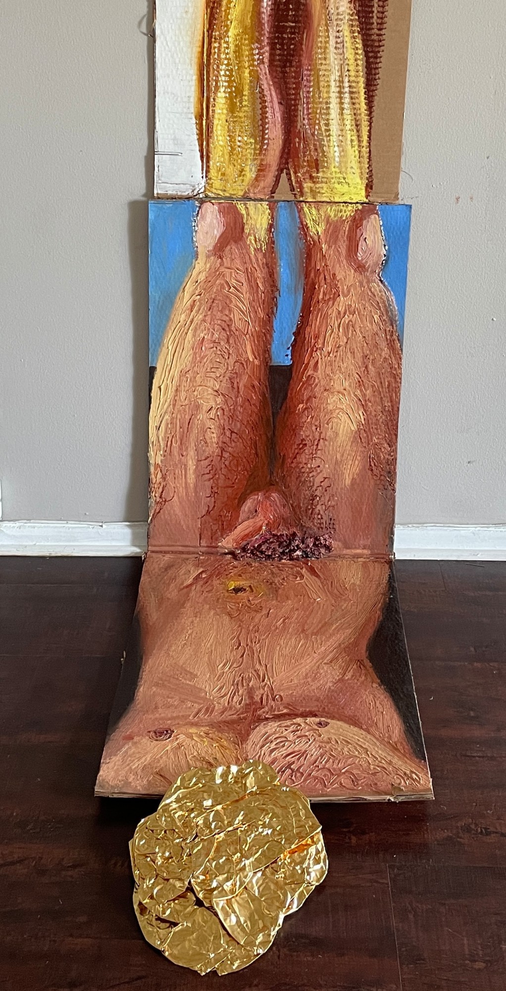 These painting-sculptures are meant to be installed against the floor and wall as pictured. They are playful explorations of locating the self; neither here nor there, the body parts are part of the universe.