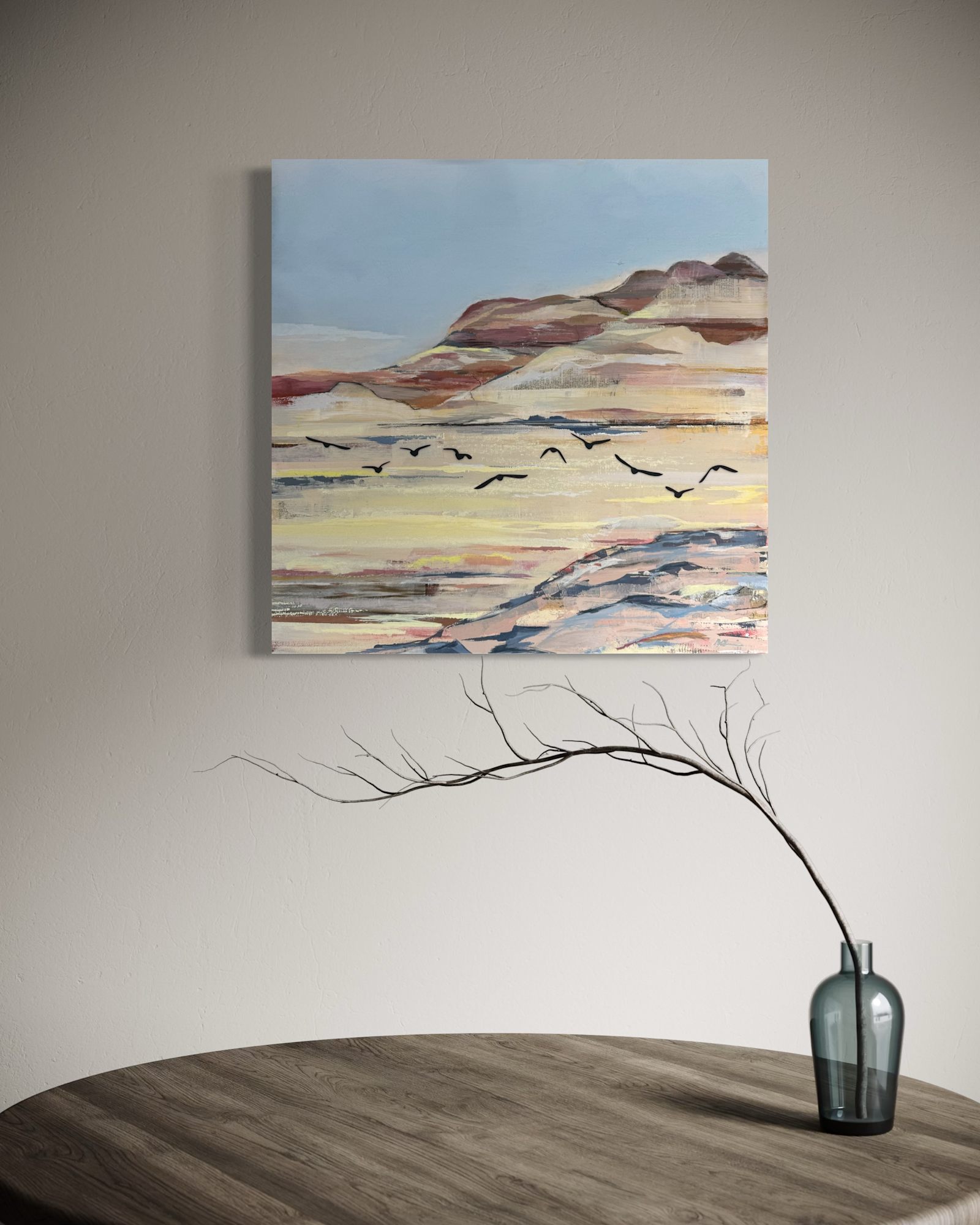 A flock of birds soaring over a vast desert landscape, returning home.