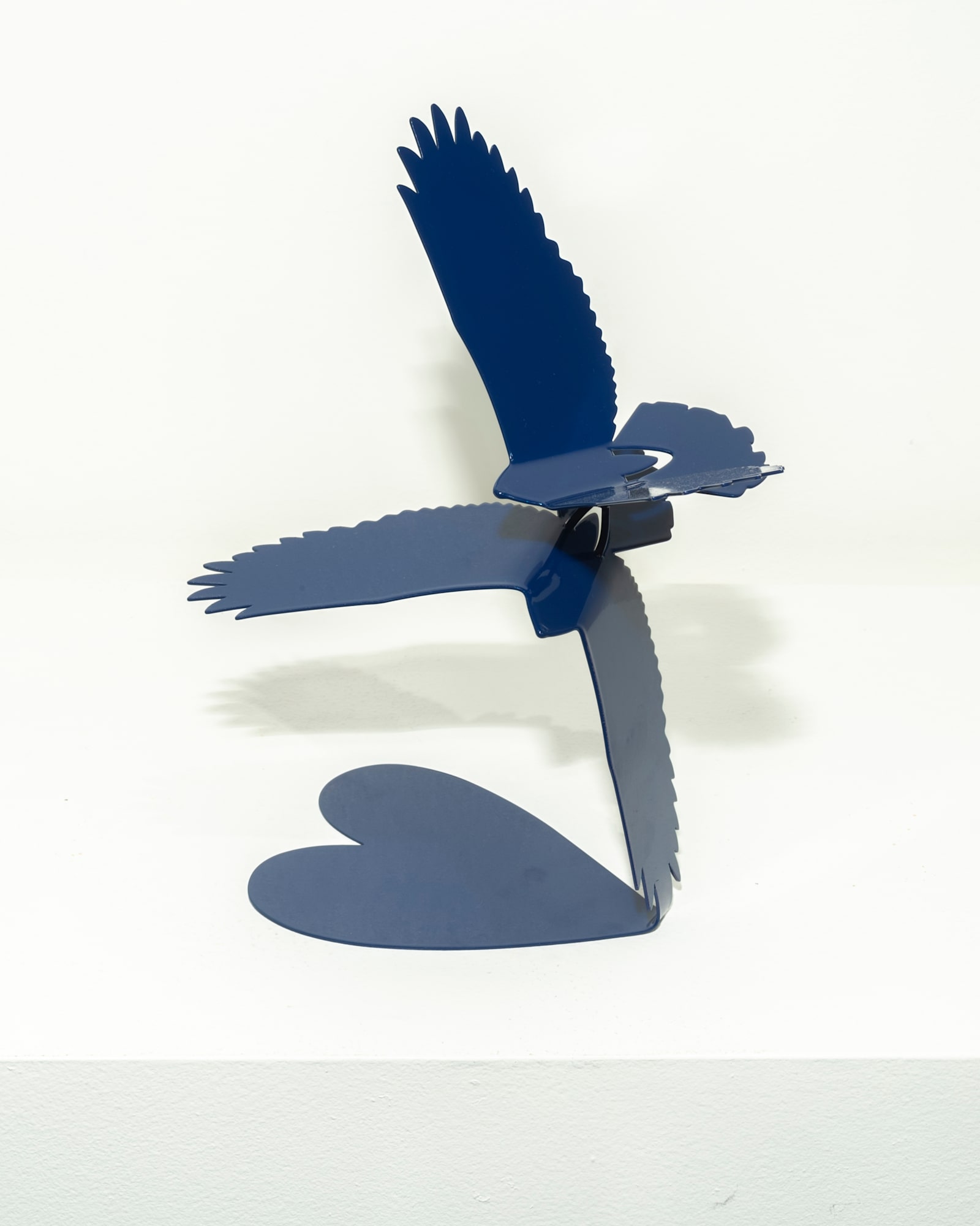 "Love Birds" is a minimalistic sculpture cut from a single piece of metal, expertly bent to depict two hawks in flight, interlocked by their talons in a mating dance. The base unfolds from the same piece into the shape of a heart.