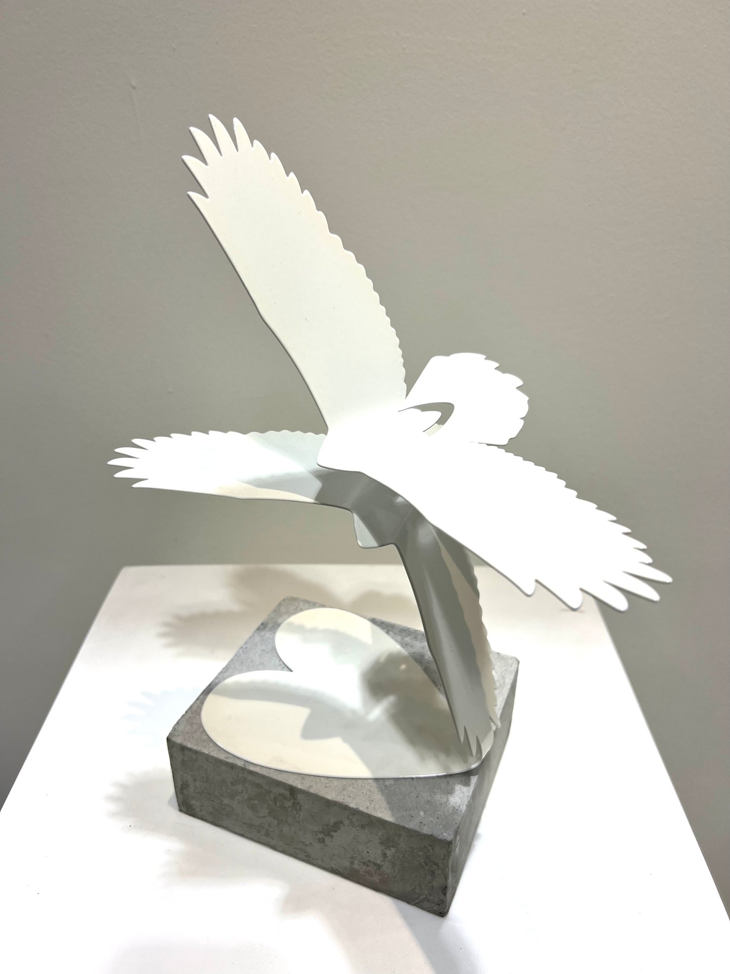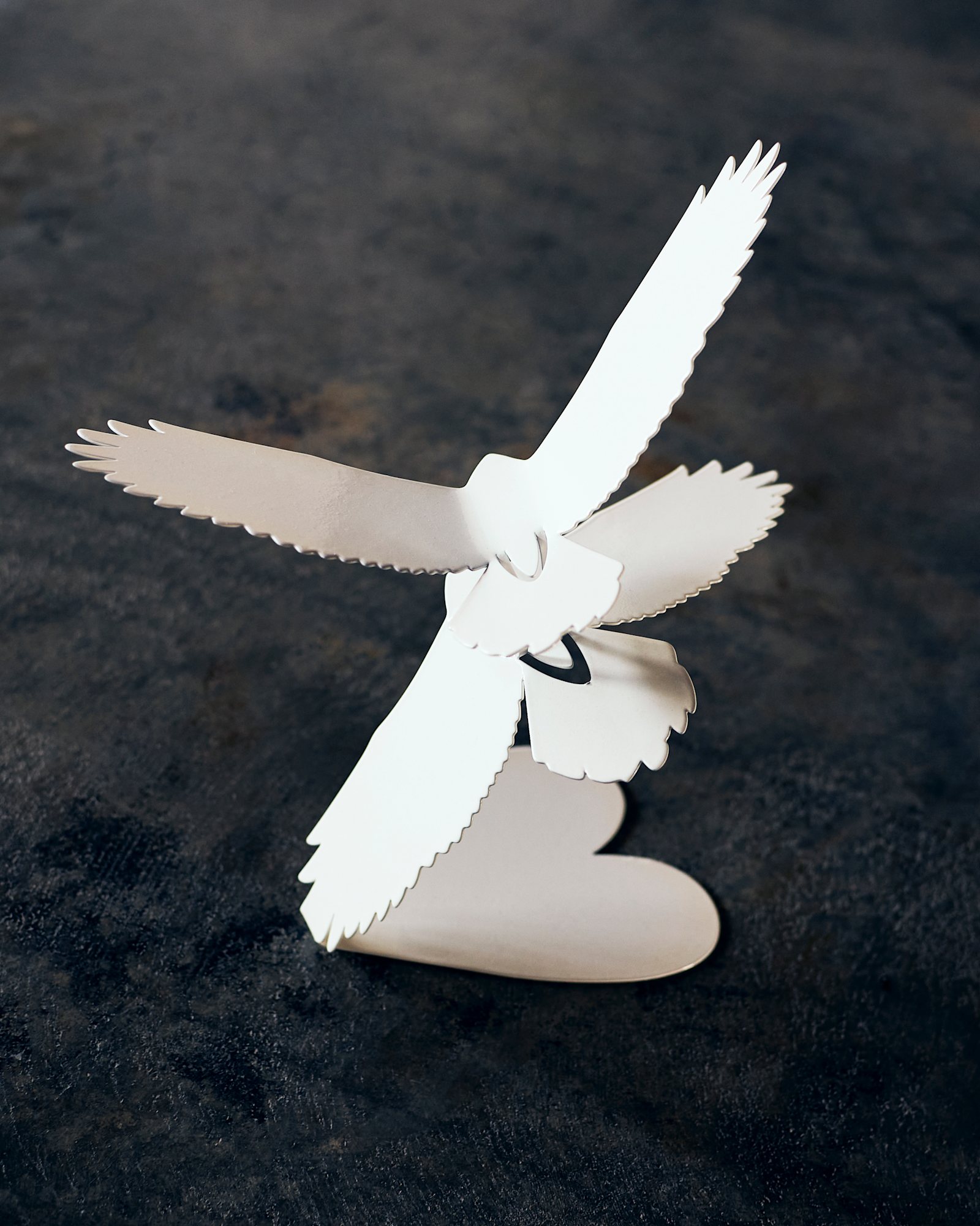 "Love Birds" is a minimalistic sculpture cut from a single piece of metal, expertly bent to depict two hawks in flight, interlocked by their talons in a mating dance. The base unfolds from the same piece into the shape of a heart.