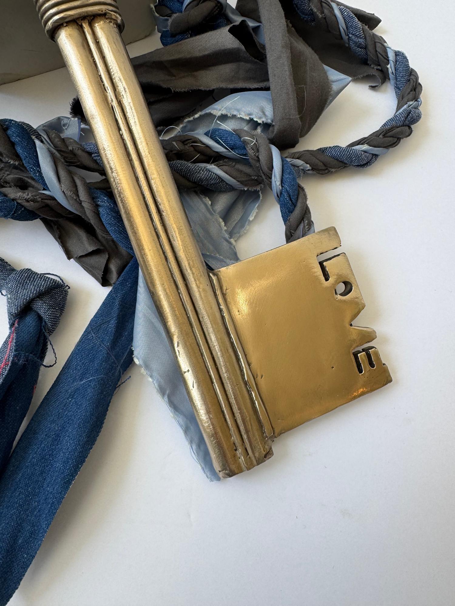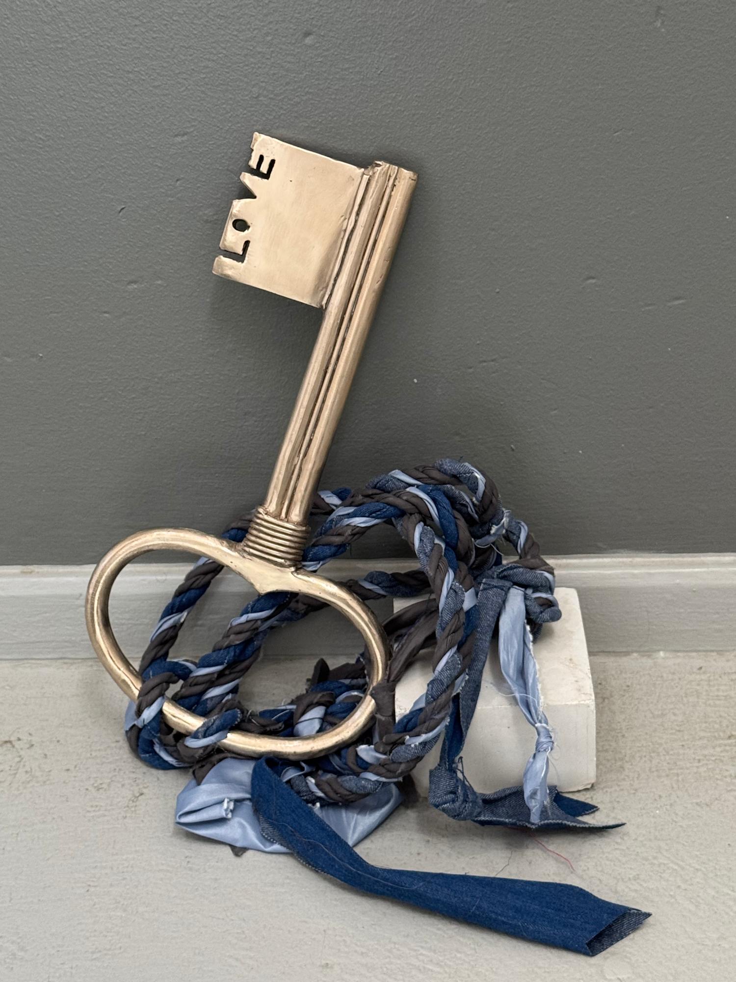 ‘Love is the Key’ combines a classic bronze key with a hand-woven rope of blue and grey fabric. The word love is sculpted into the metal, a reminder that only love has a way of unlocking things we cannot force open.