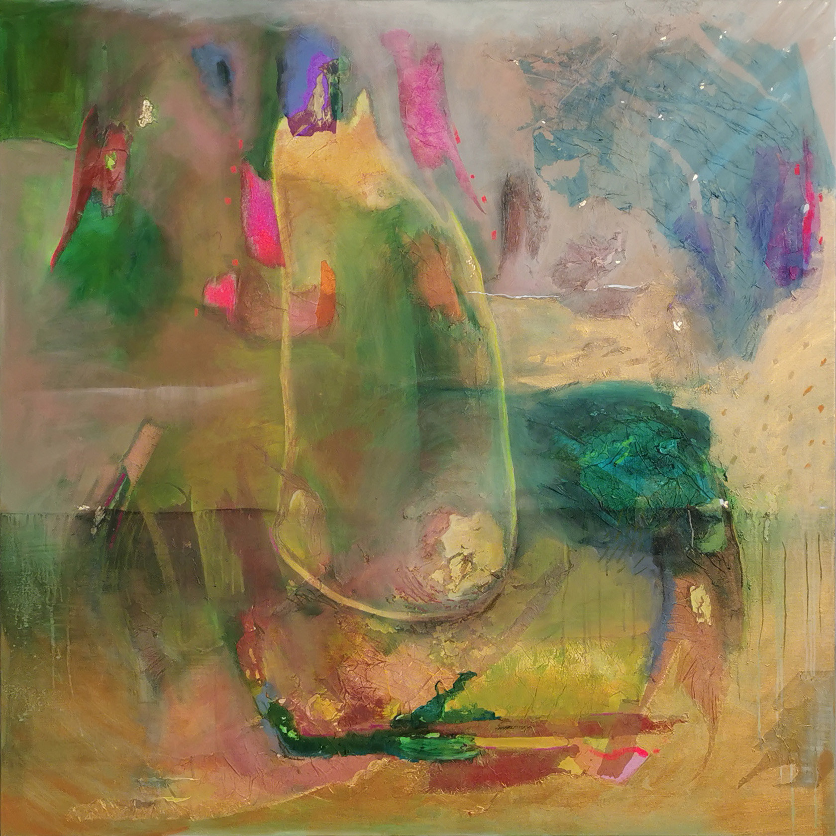 Through layers of translucent greens, warm earth tones, and sudden luminous bursts of pink and gold, I sought to translate not a likeness, but a presence. Each gesture was guided by sensing rather than planning; a rhythm of release and emergence. The work reflects the energy of connection. Connection to the self, to the unseen, and to the living pulse of color itself.