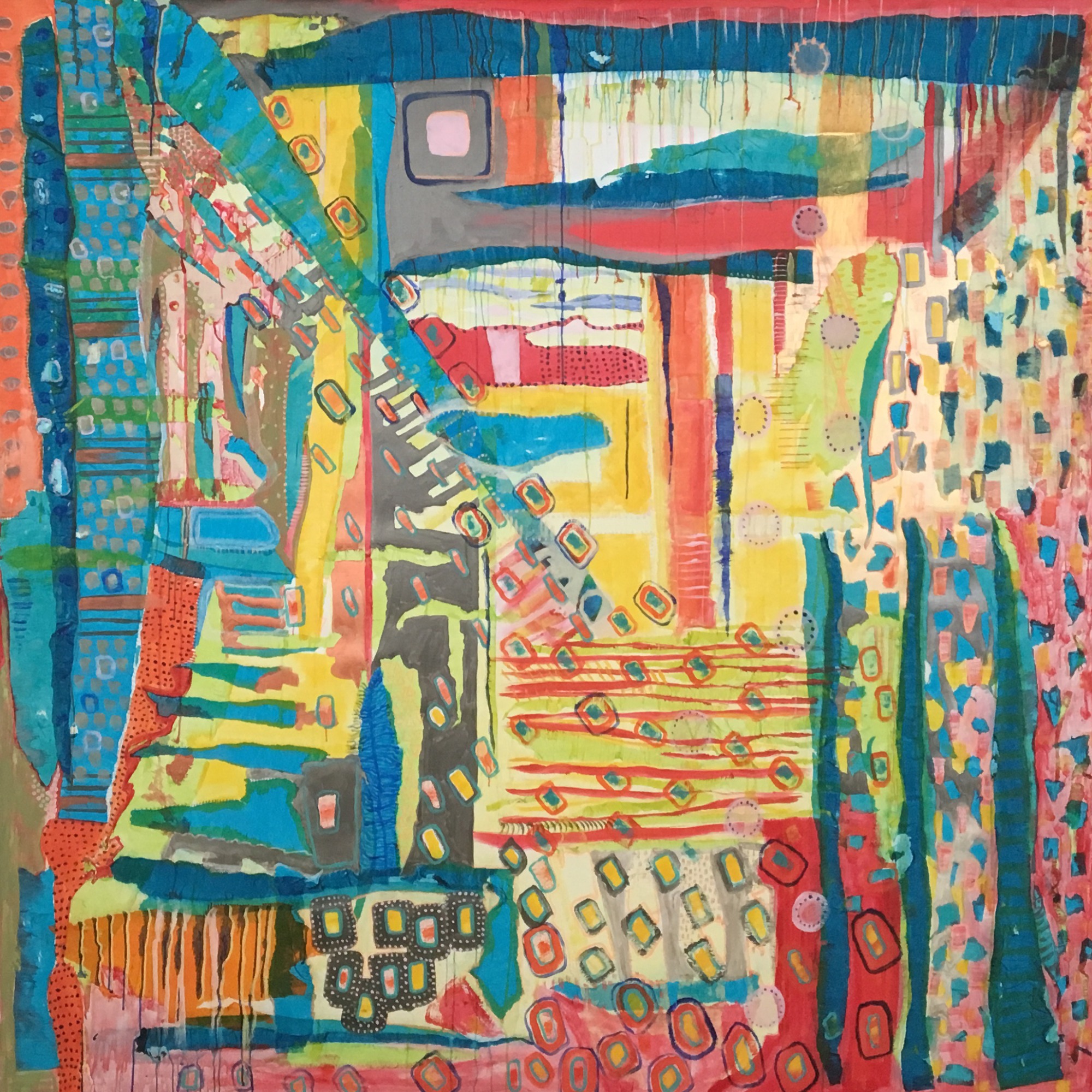 Acrylic, metalic paint, ink, soft pastel, oil pastel, gold leaf, paper