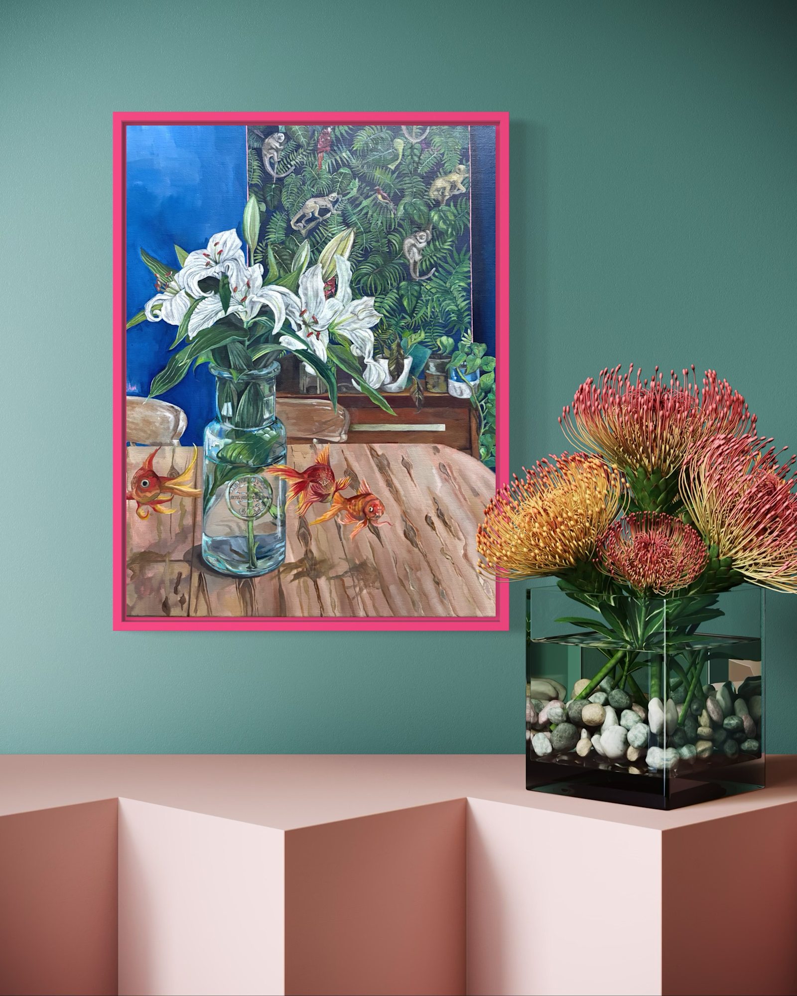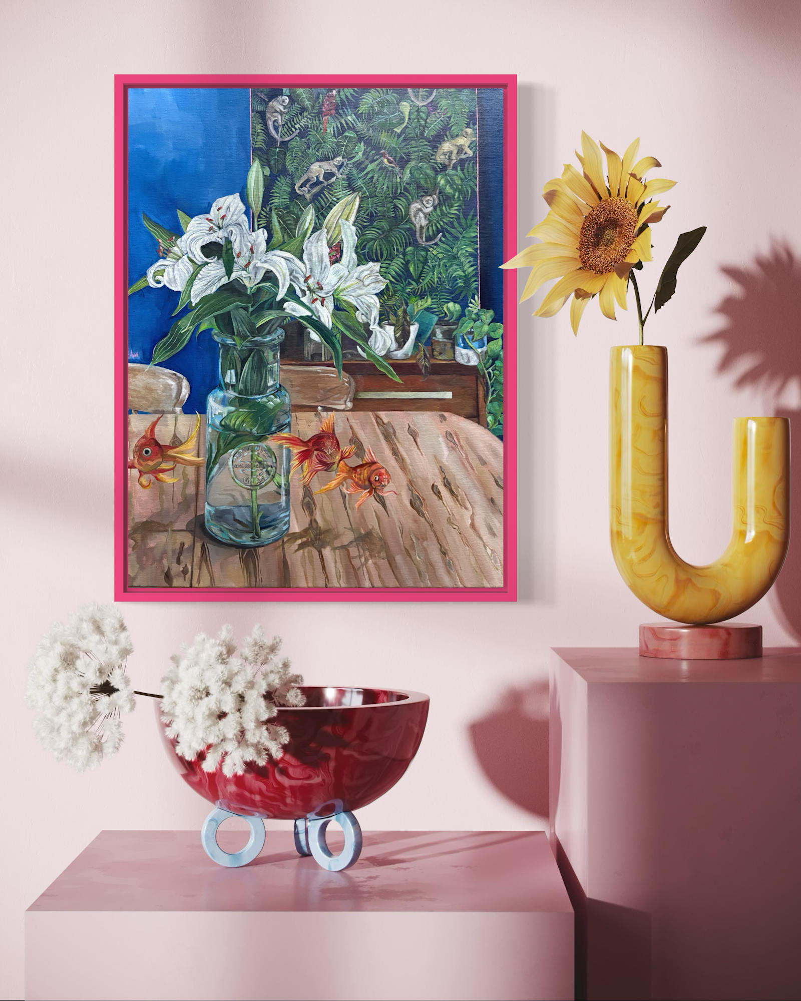 The four goldfish, swimming freely around the vase, evoke my childhood curiosity and wonder at the world. As a mother, I found similar moments of stillness and connection when watching animals with my own children, witnessing their quiet fascination.