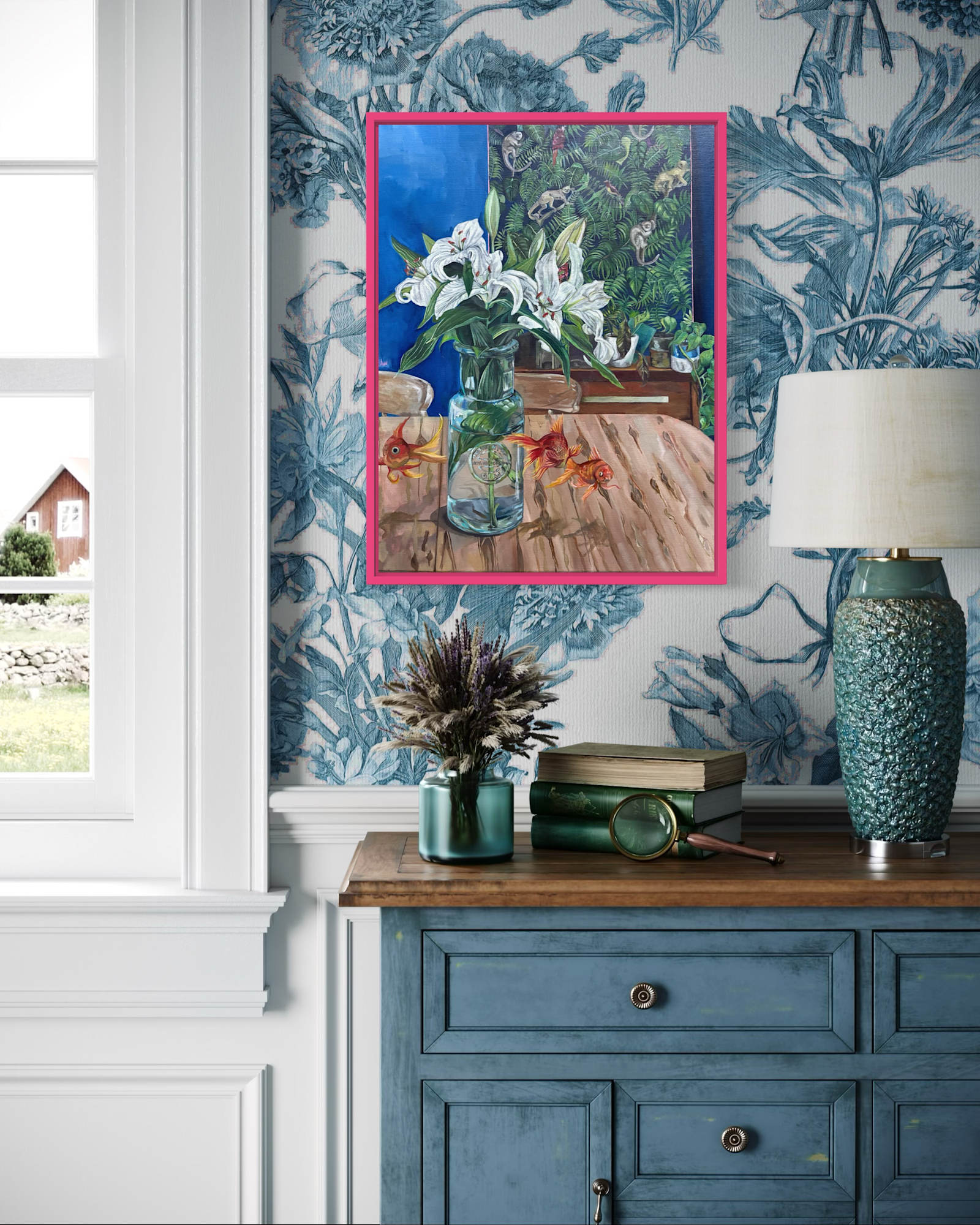 The lilies in the vase recall my mother’s constant presence of flowers in our home—small, beautiful rituals that grounded the domestic space. The wallpapered jungle print hints at the unseen chaos of daily life, where nature’s beauty mingles with its wild unpredictability.