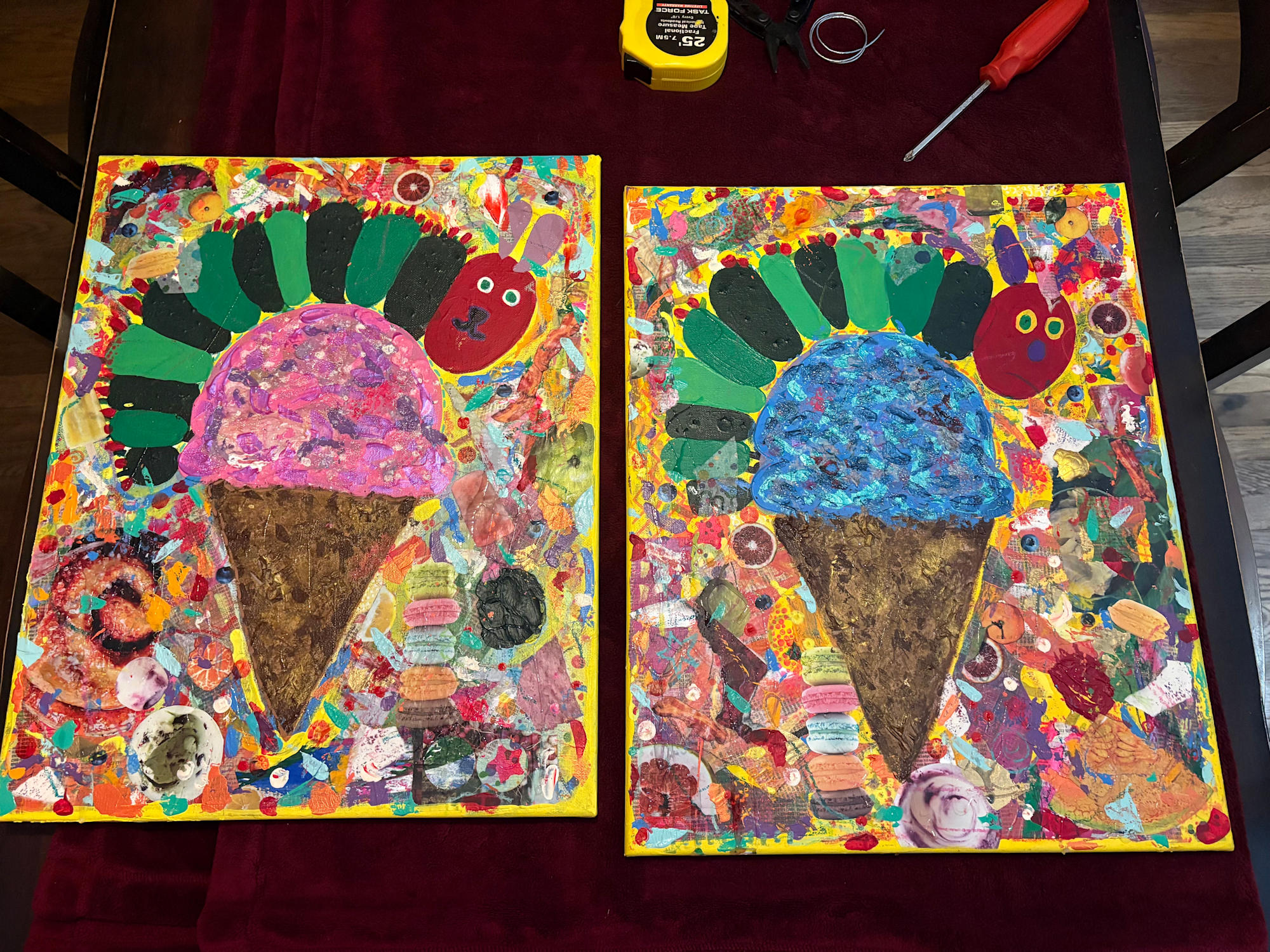 Upcycled canvases from neighbor kids. This caterpillar + cone was made by the son at age 6. All additional paint and collage elements are my own.