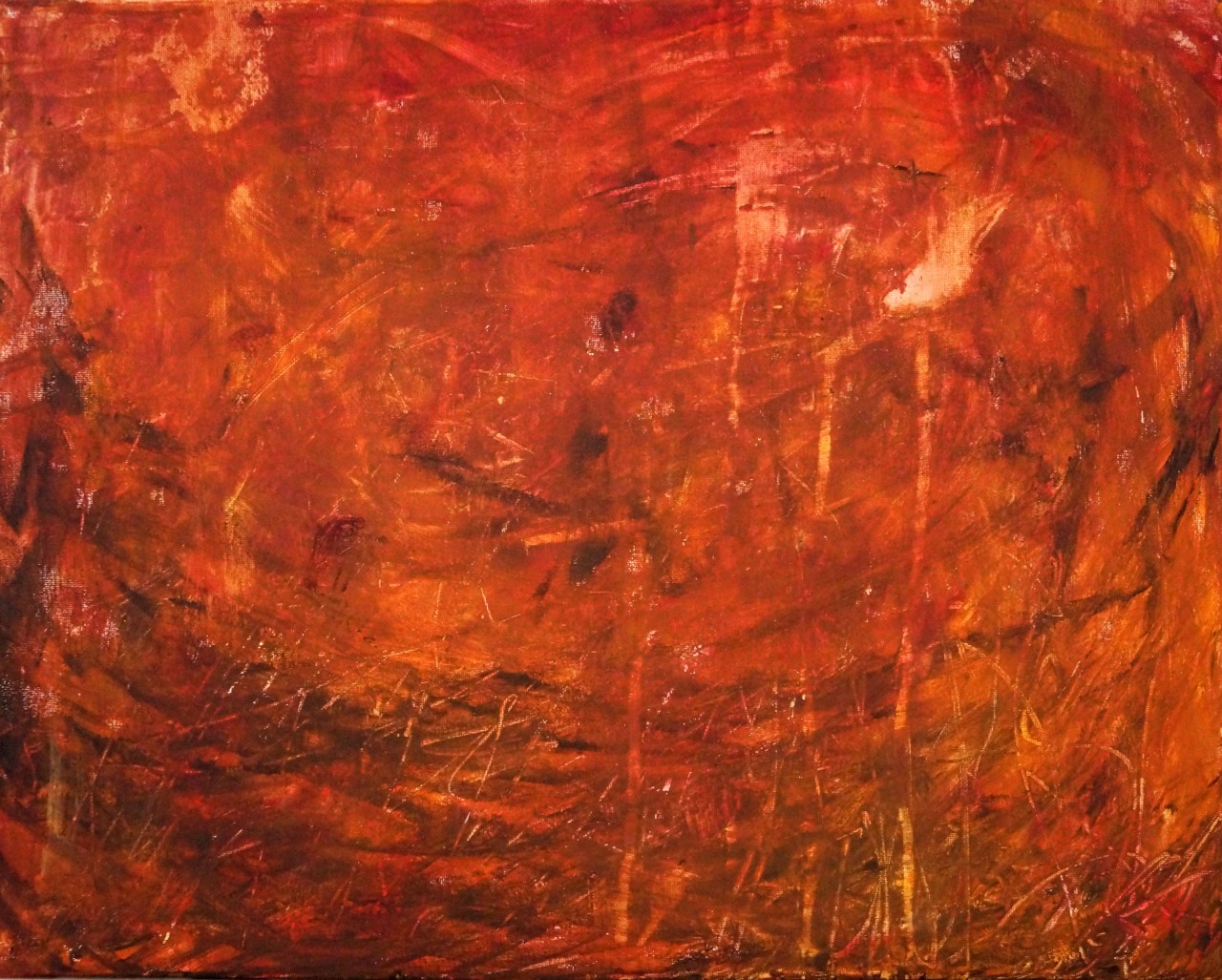 The next day, I painted this work. There's a vibrance to the color, but also an emotional angst embedded in the image. I can almost see bird shapes and spinning or flying figures, masked in the deep orange color as if they’re struggling to break free so they can fly unburdened.