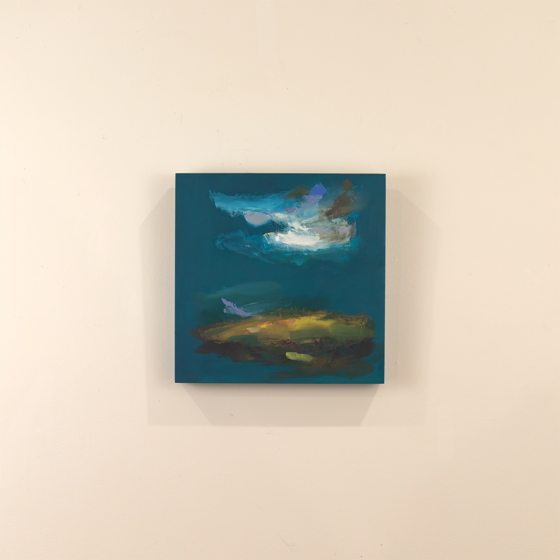 Cobalt teal sides and background. Floating clouds and land on top. A pair with Monologue 35. This has taller cloud and land.