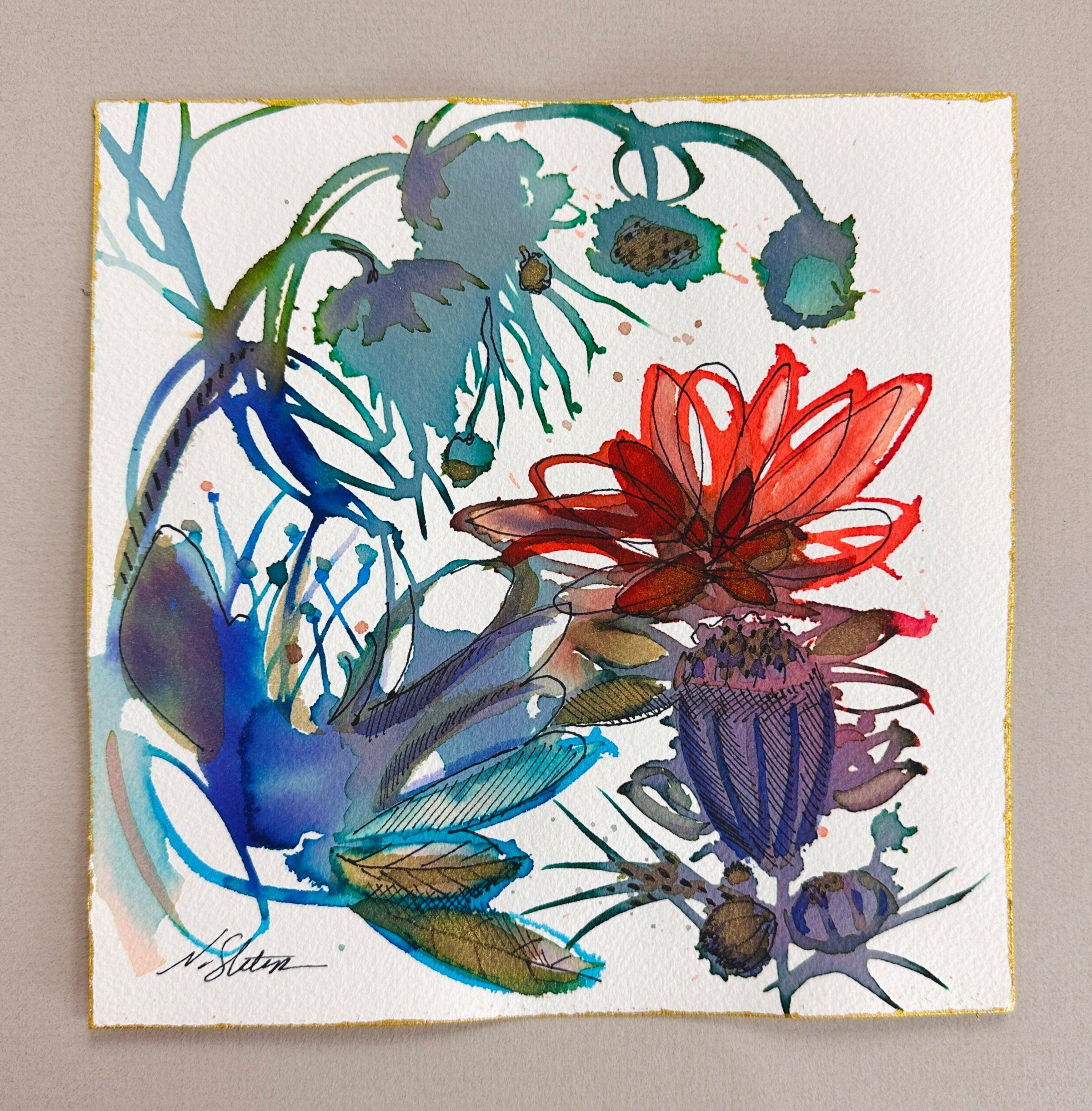 This beautiful paper art measures 10 x 10" and comes with a mat board for easy display. It has been securely attached using archival museum tape, creating a visually pleasing border. The organic waves in the paper are intentional and add to its charm. You can frame it using your preferred frame or remove the hinge mount for a more customized look. This art piece will be a great addition to your collection.