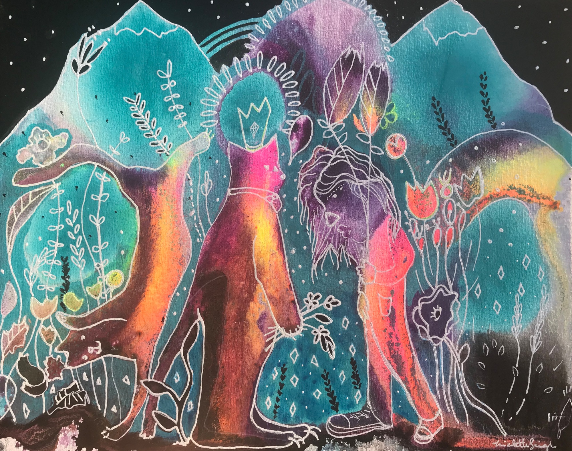 landscape, dreamscape, cats, figures, character, childrens illustration, illustration